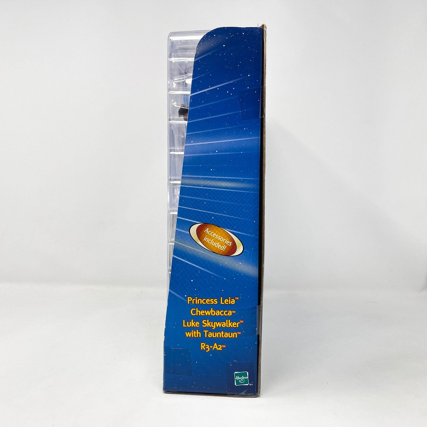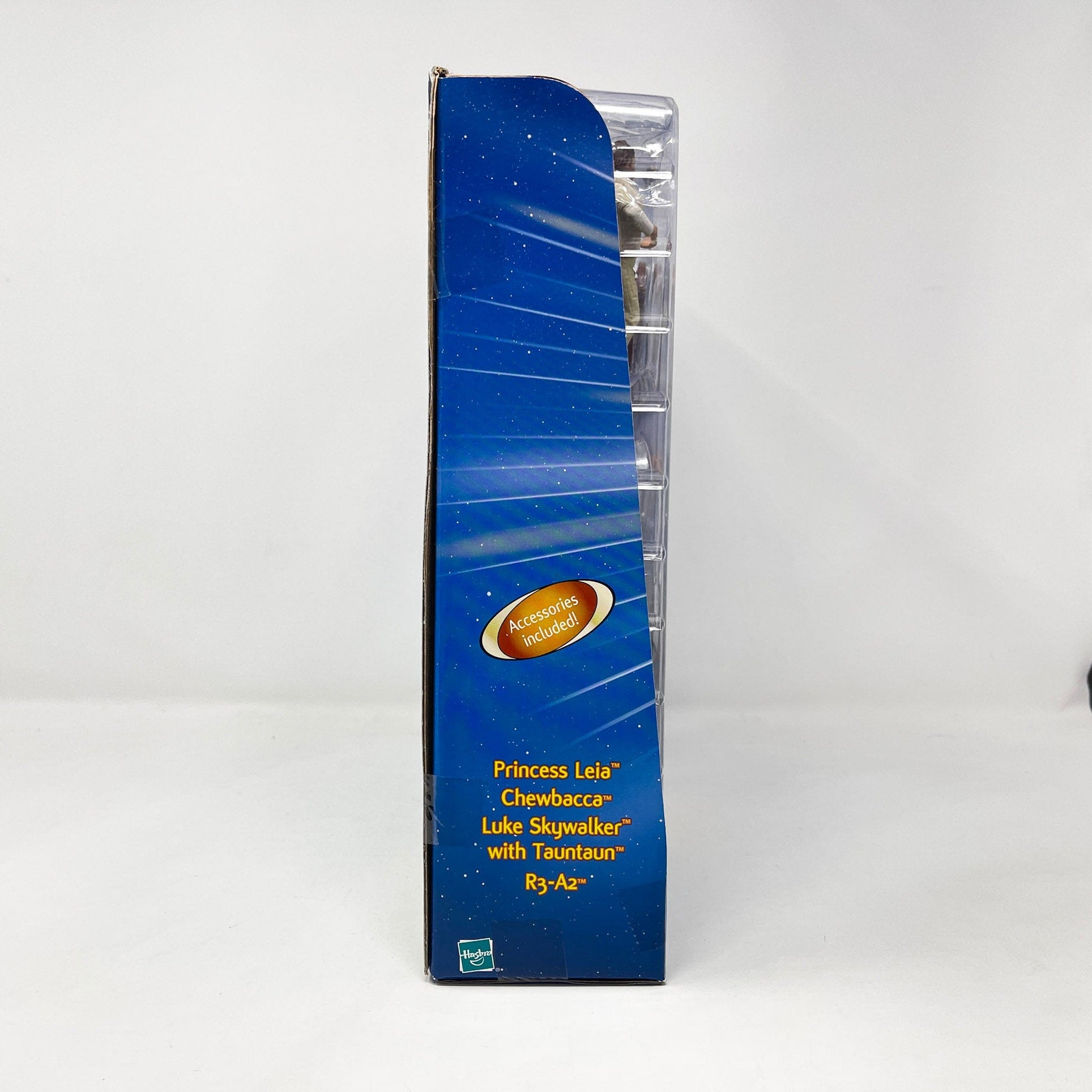 Princess Leia, Chewbacca R3-A2 astromech droid, Luke Skywalker, a Tauntaun and 4 plastic stands in a cool window box.