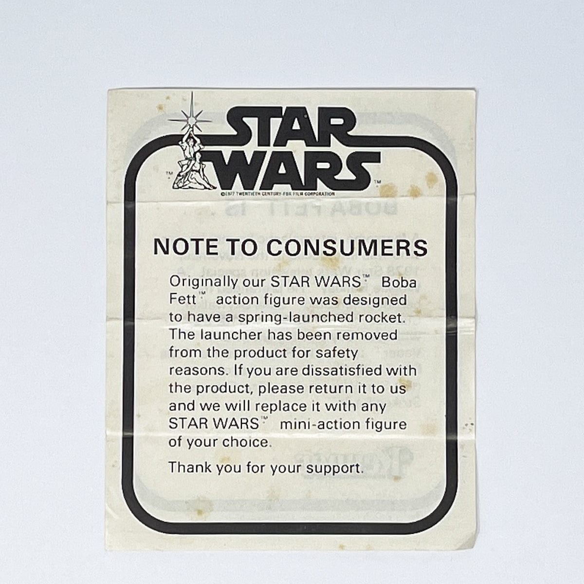 The story of the rocket firing Boba Fett is legend now. This letter was included in the mailer package with the Boba Fett figures that went out.