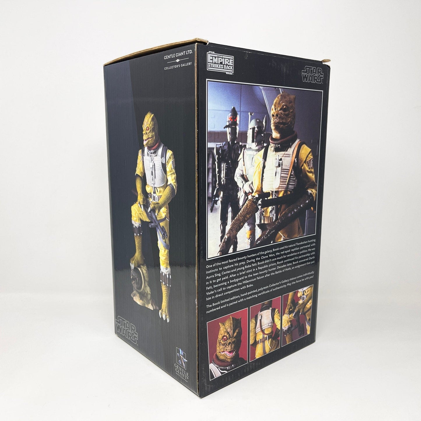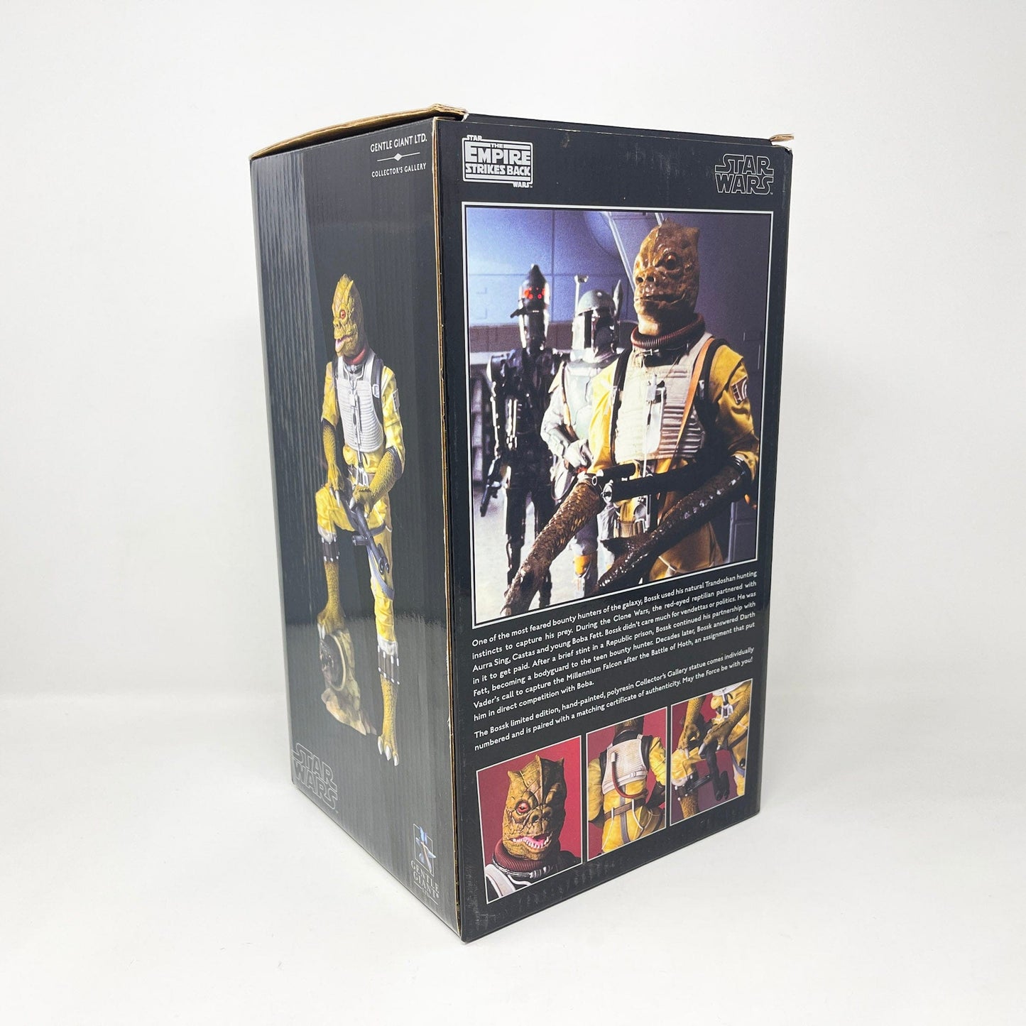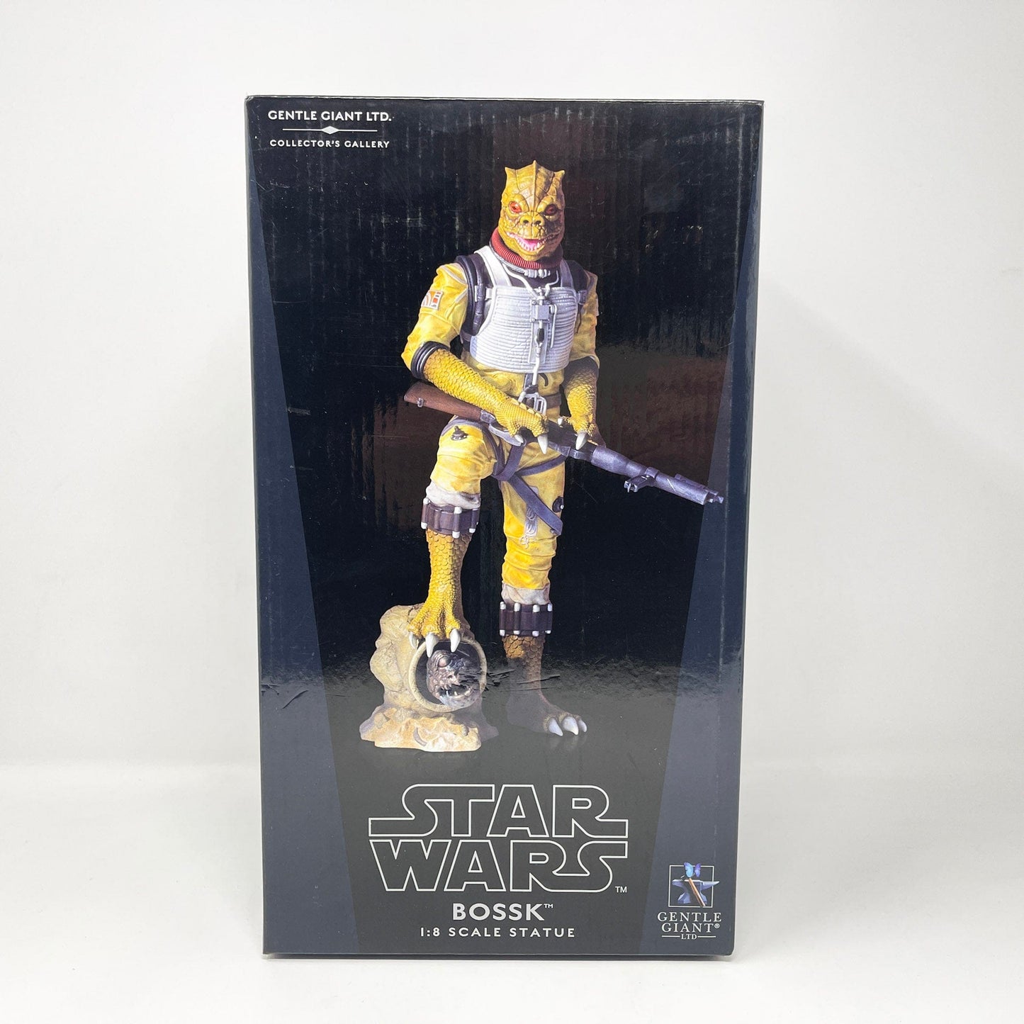 The bounty hunter known as Bossk has been a fan favorite ever since his debut in 1980. His popularity could not be contained to his brief appearance on the deck of the Executor in the Empire Strikes Back (and in the background of Jabba’s sail barge in Return of the Jedi). Bossk soon started filling out his robust backstory in both the Star Wars: Clone Wars and Star Wars: Rebels animated series, taking on the role of mentor to the young, orphaned Boba Fett. The artists a Gentle Giant take you on a journey to see the moments just following the events of the death of Jabba, we find Bossk standing over the shattered throne of Jabba. At his feet, a chain left by Jabba’s escaped prize. What will he do next? Pursue the rebels or look for his next bounty? Bossk is the third statue in our new 1:8th Collector’s Gallery line, celebrating 40 years of the Star Wars universe. Each limited edition, hand-painted piece is cast in high quality polyresin with crisp details. This statue also comes individually numbered with a matching certificate of authenticity.