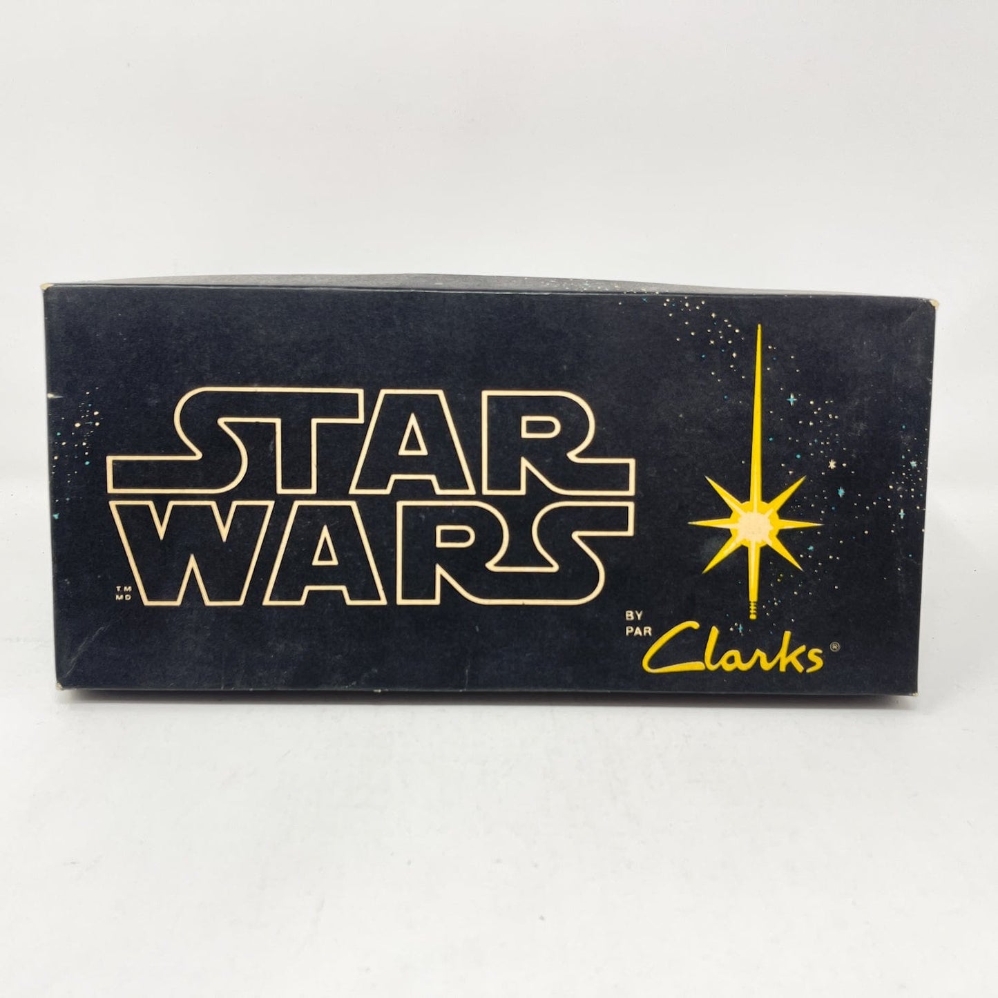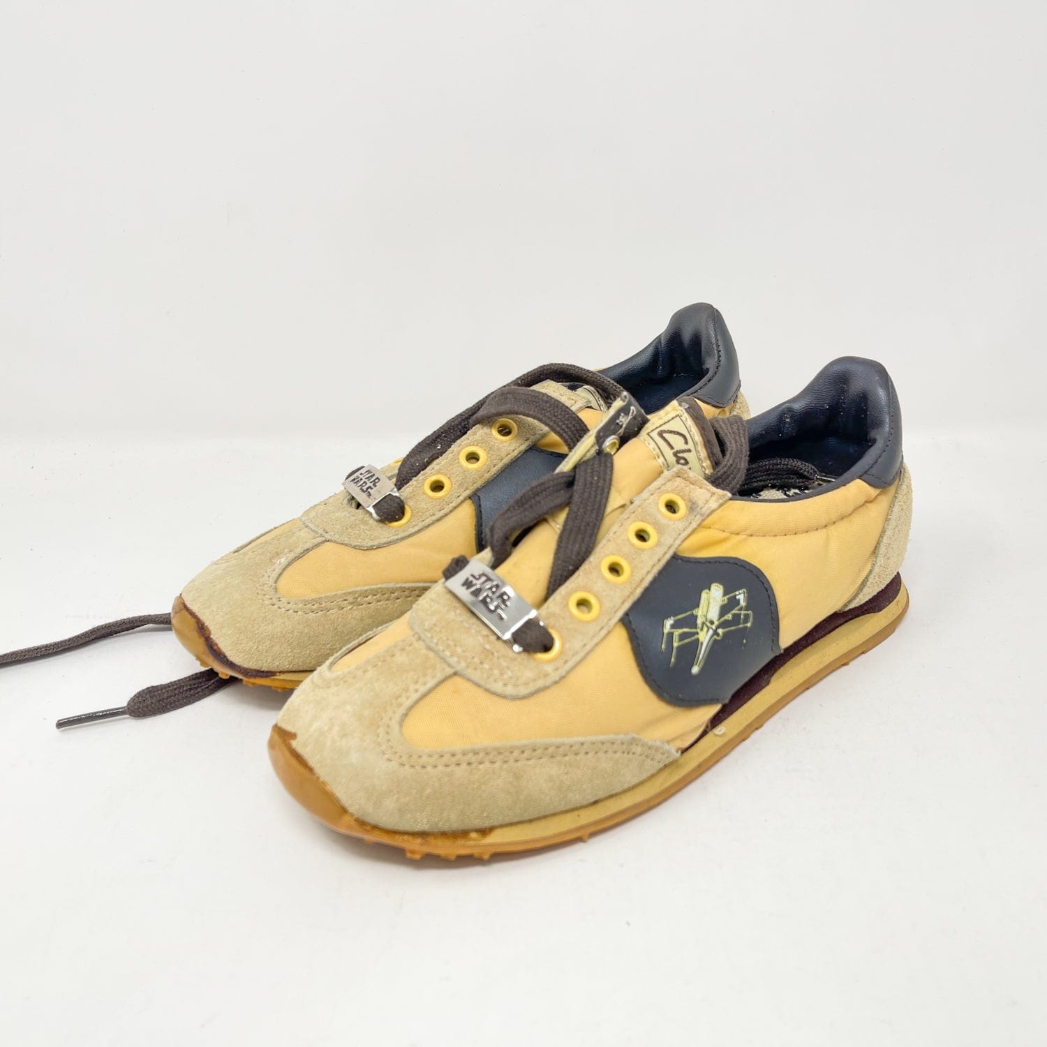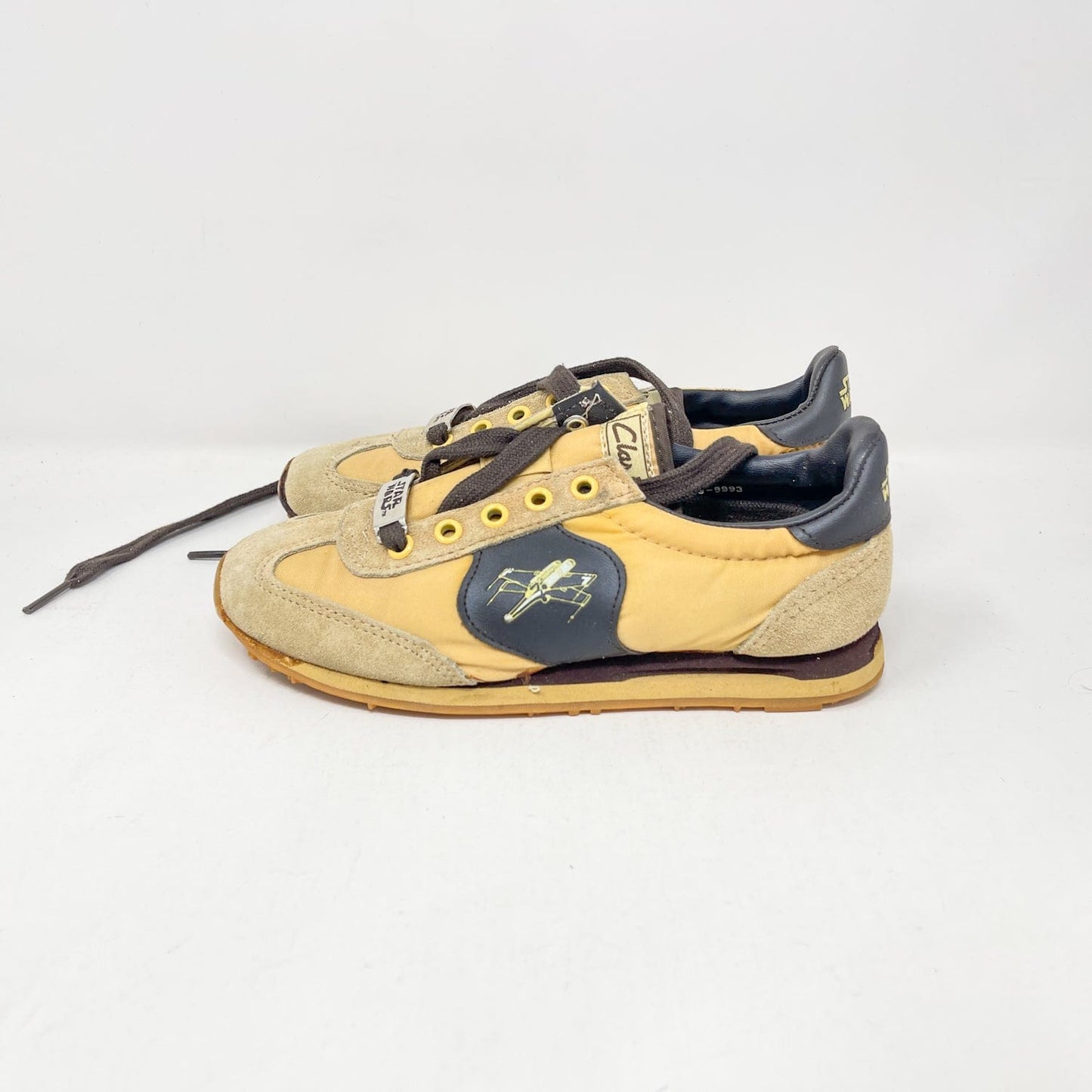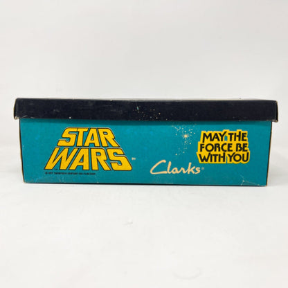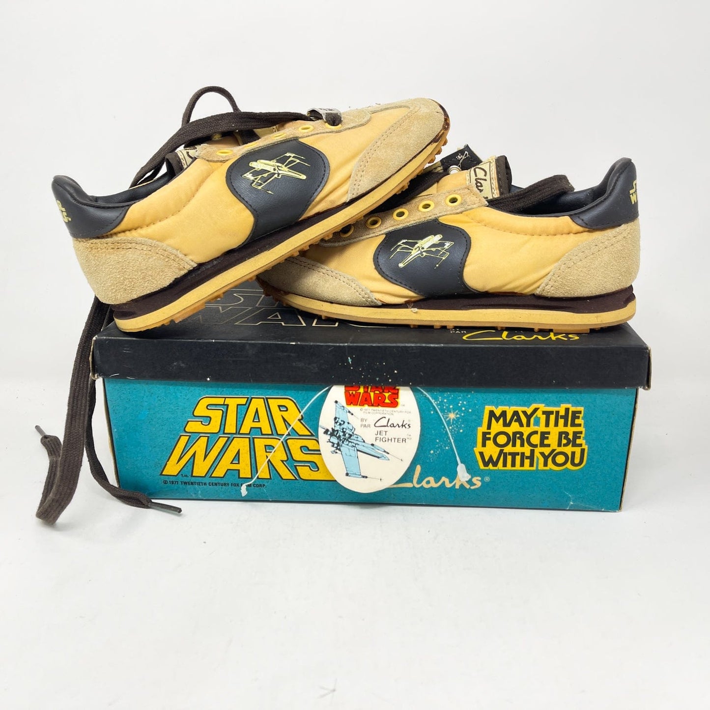 An exceptional vintage collectible from Clarks’ Star Wars collaboration — the Jet Fighter Running Shoes, featuring bold X-Wing artwork and Star Wars branding. Each pair includes the original Canadian bilingual box, factory tag, and Clarks shoe bag.