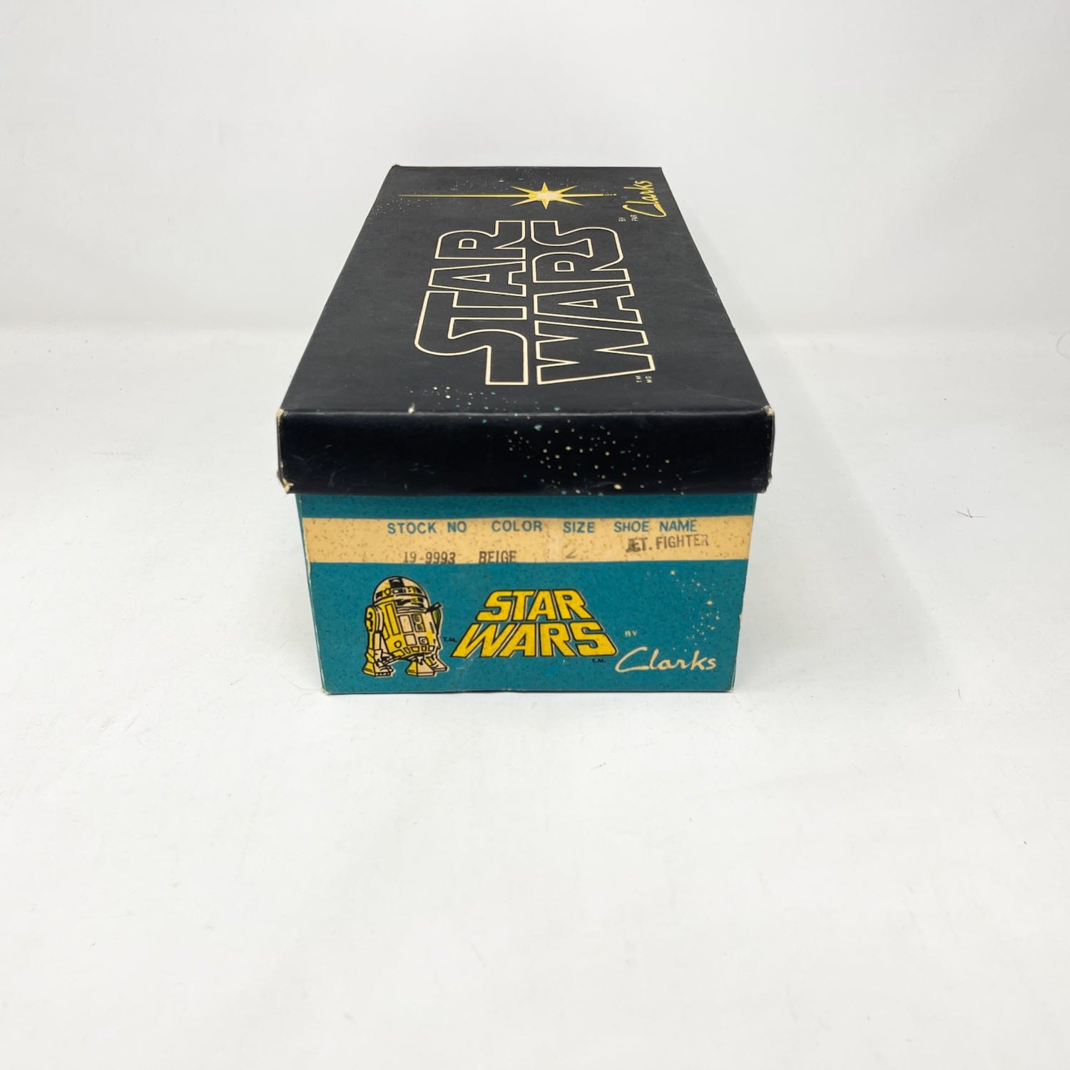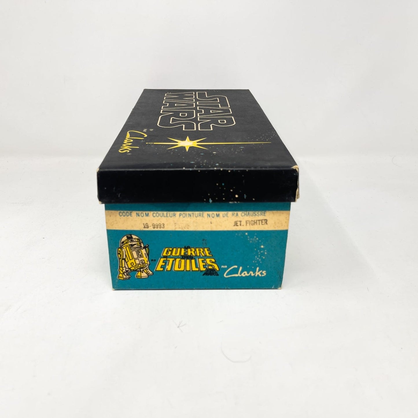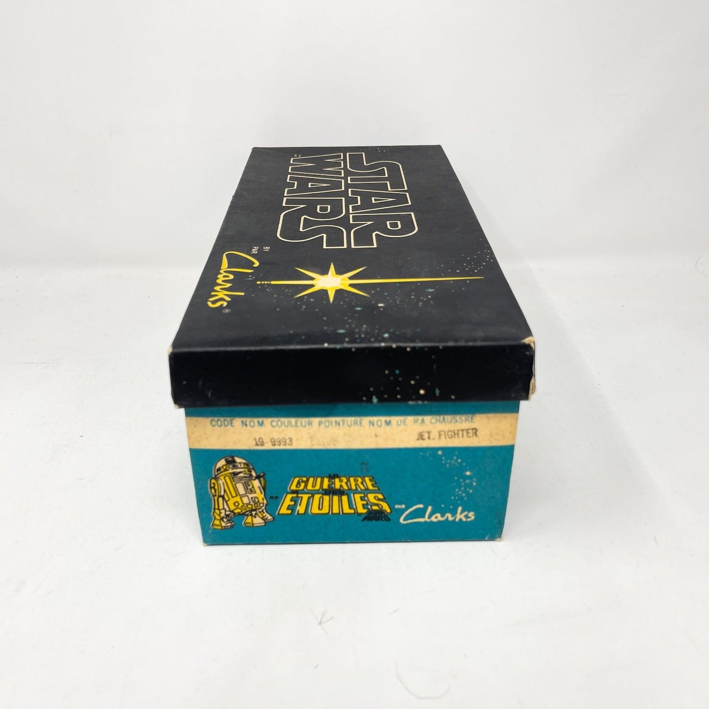 An exceptional vintage collectible from Clarks’ Star Wars collaboration — the Jet Fighter Running Shoes, featuring bold X-Wing artwork and Star Wars branding. Each pair includes the original Canadian bilingual box, factory tag, and Clarks shoe bag.