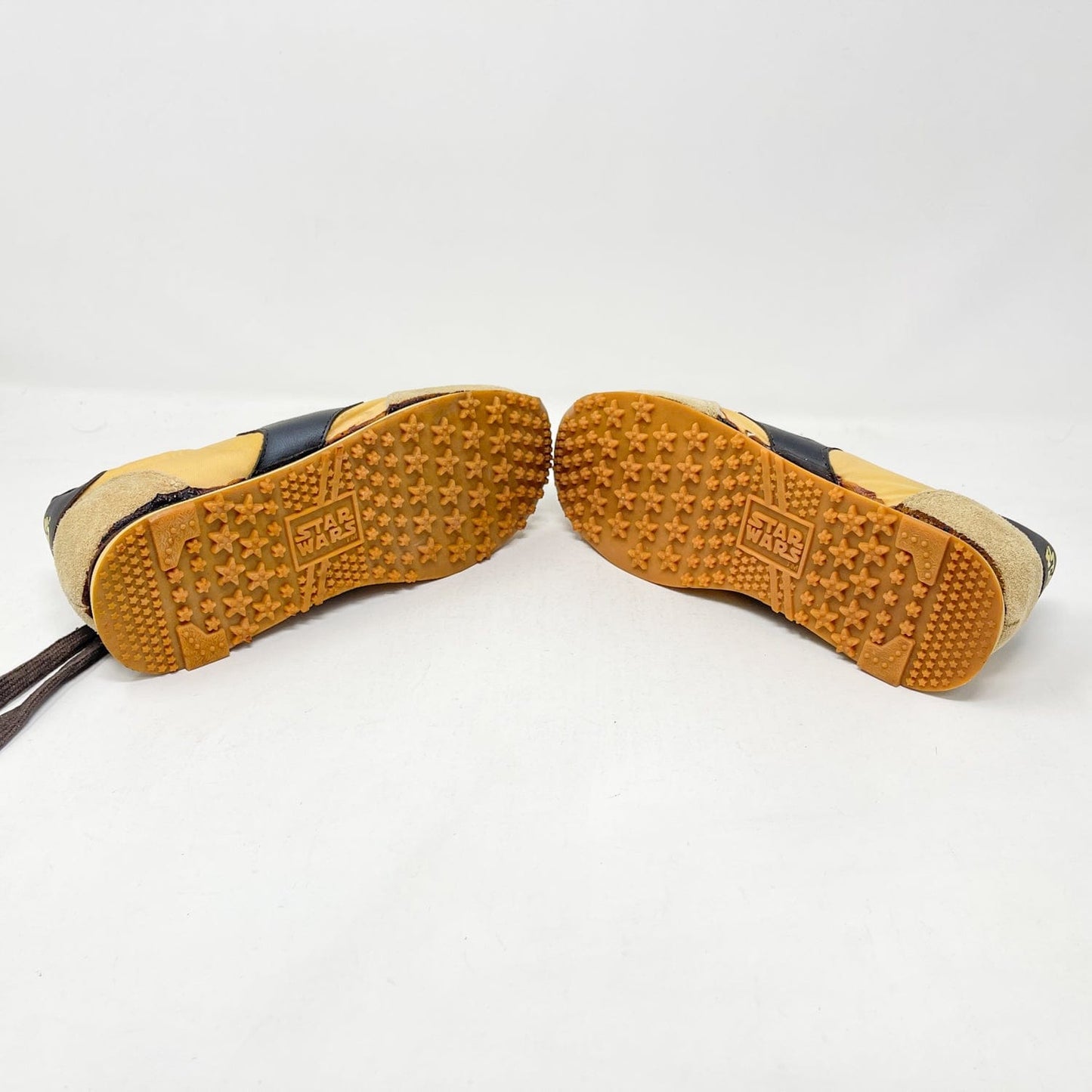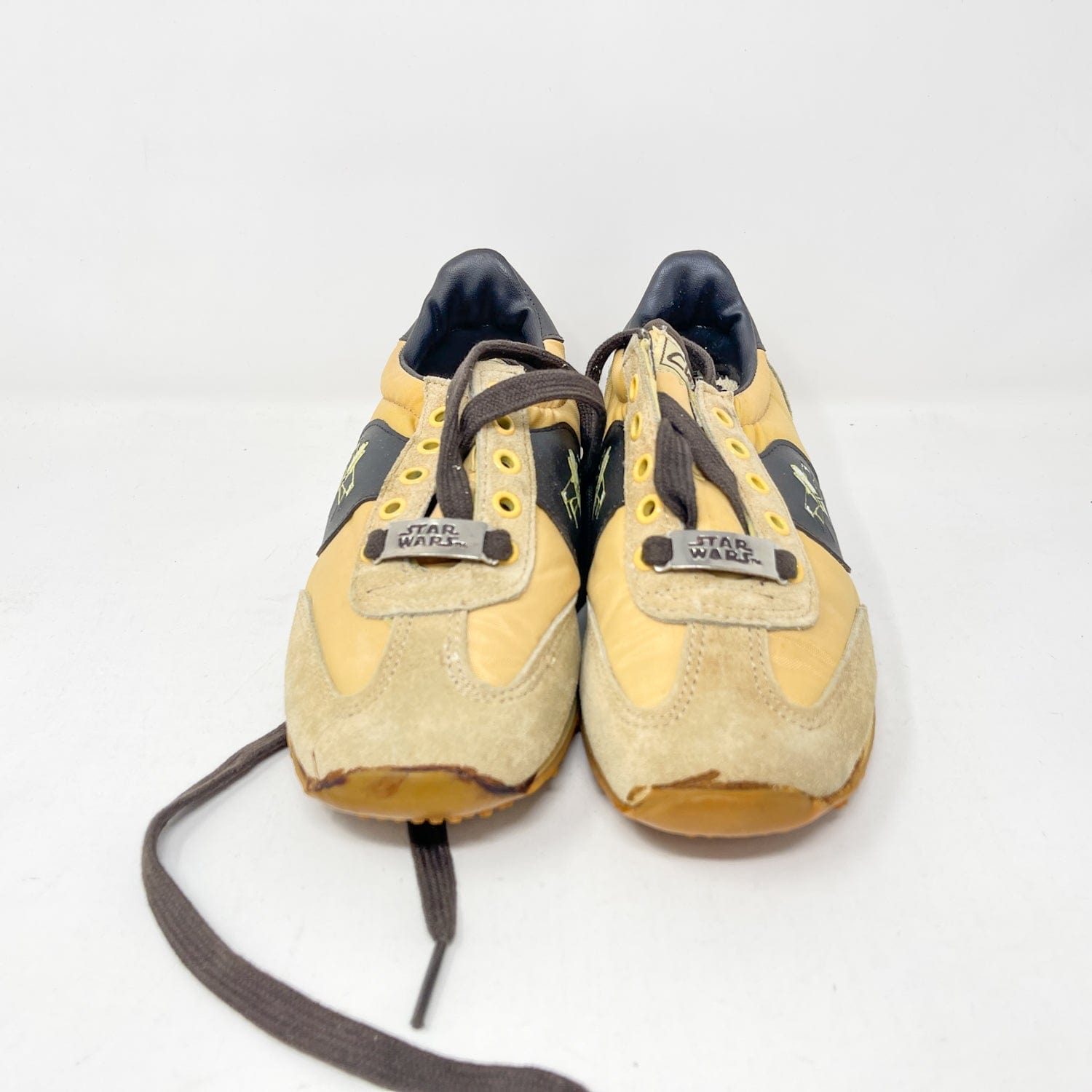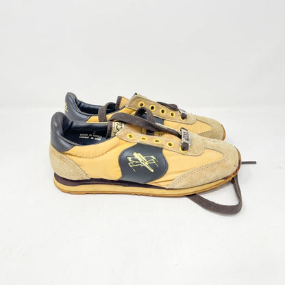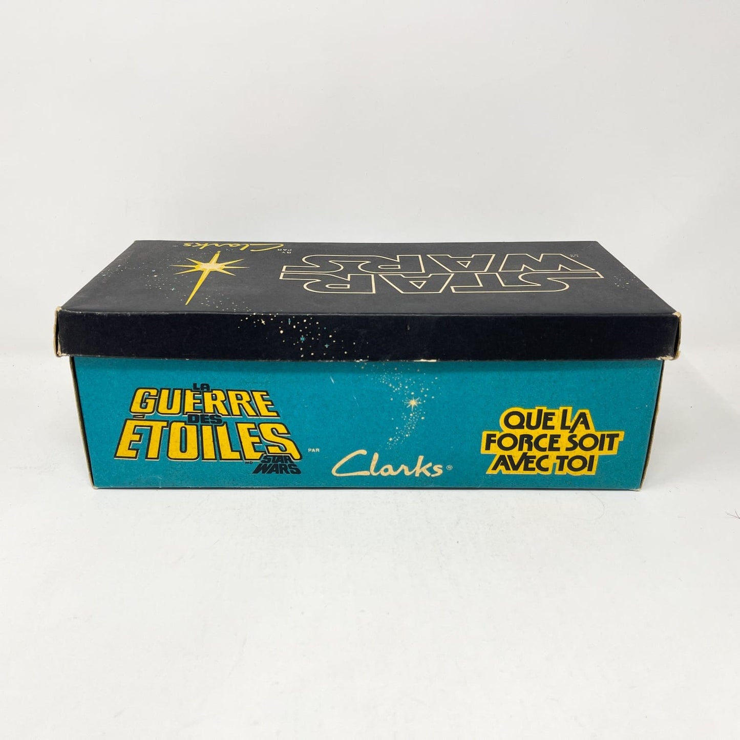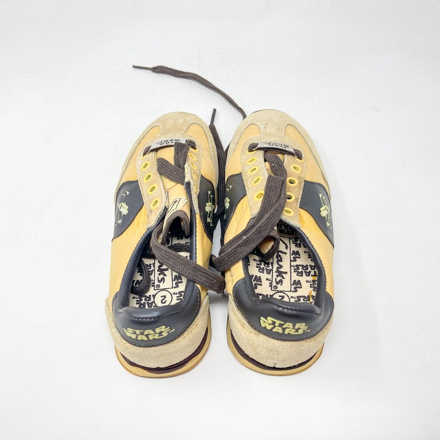 An exceptional vintage collectible from Clarks’ Star Wars collaboration — the Jet Fighter Running Shoes, featuring bold X-Wing artwork and Star Wars branding. Each pair includes the original Canadian bilingual box, factory tag, and Clarks shoe bag.