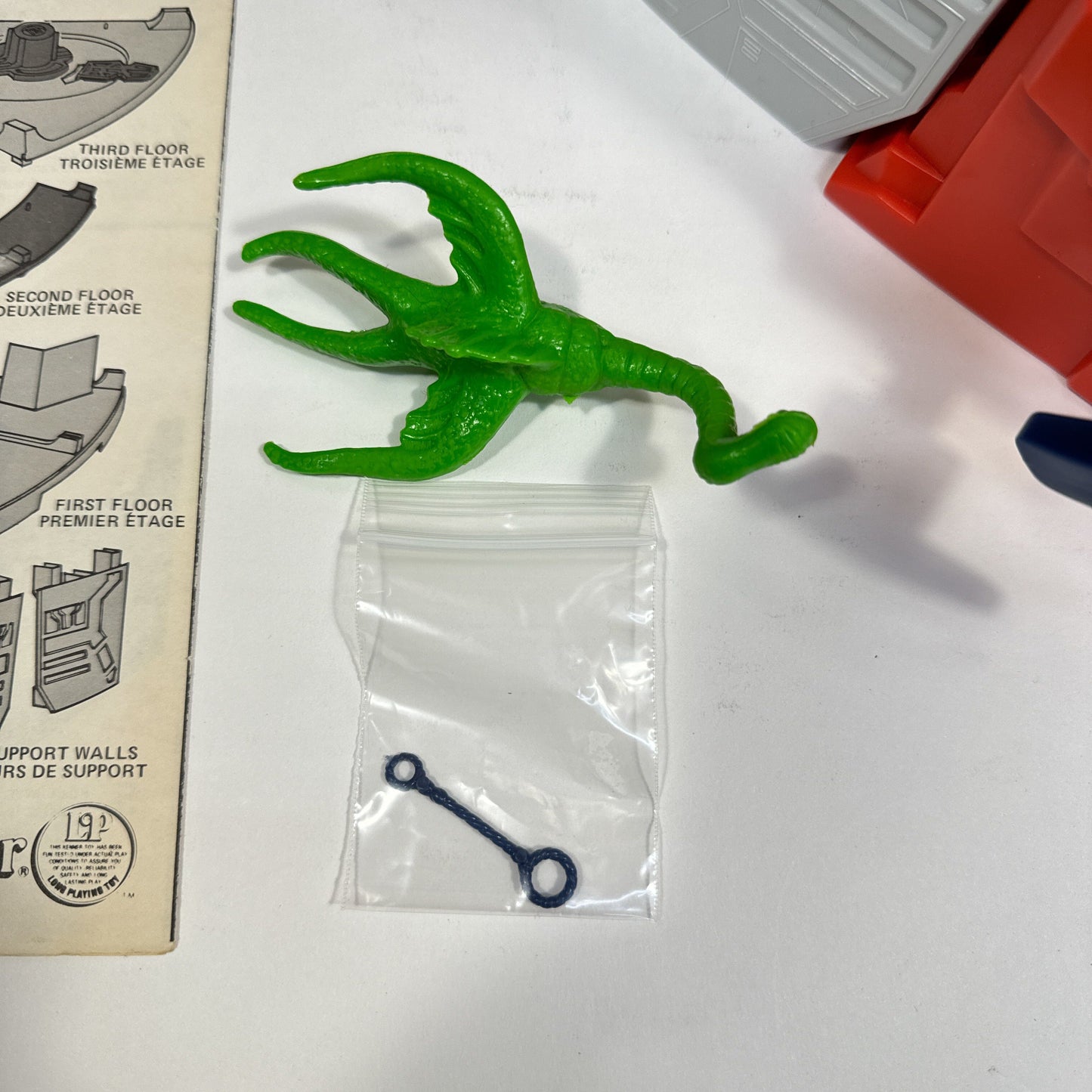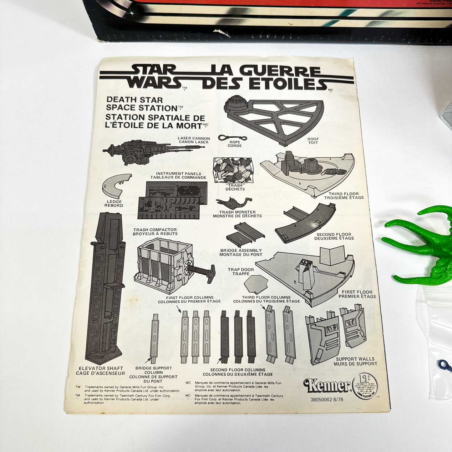 This Death Star Playset is complete with all parts including hard to find trash compactor dianoga figure and swing rope. The top gun doesn't snap in (they rarely do). Also includes Canadian bilingual instructions.