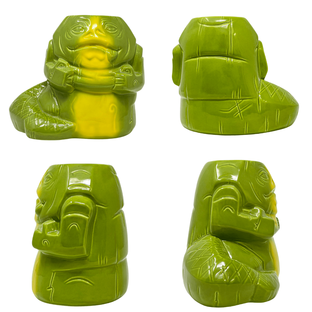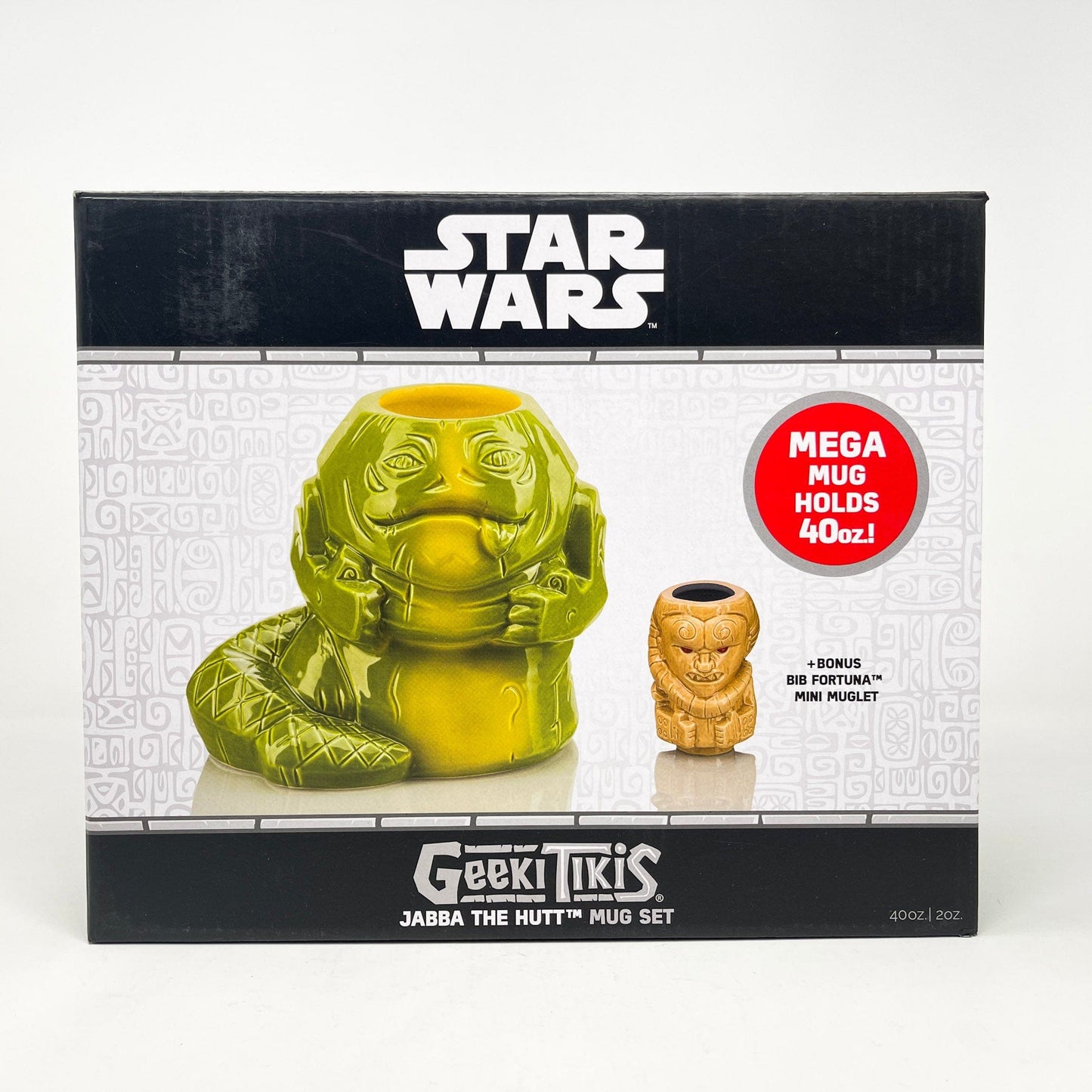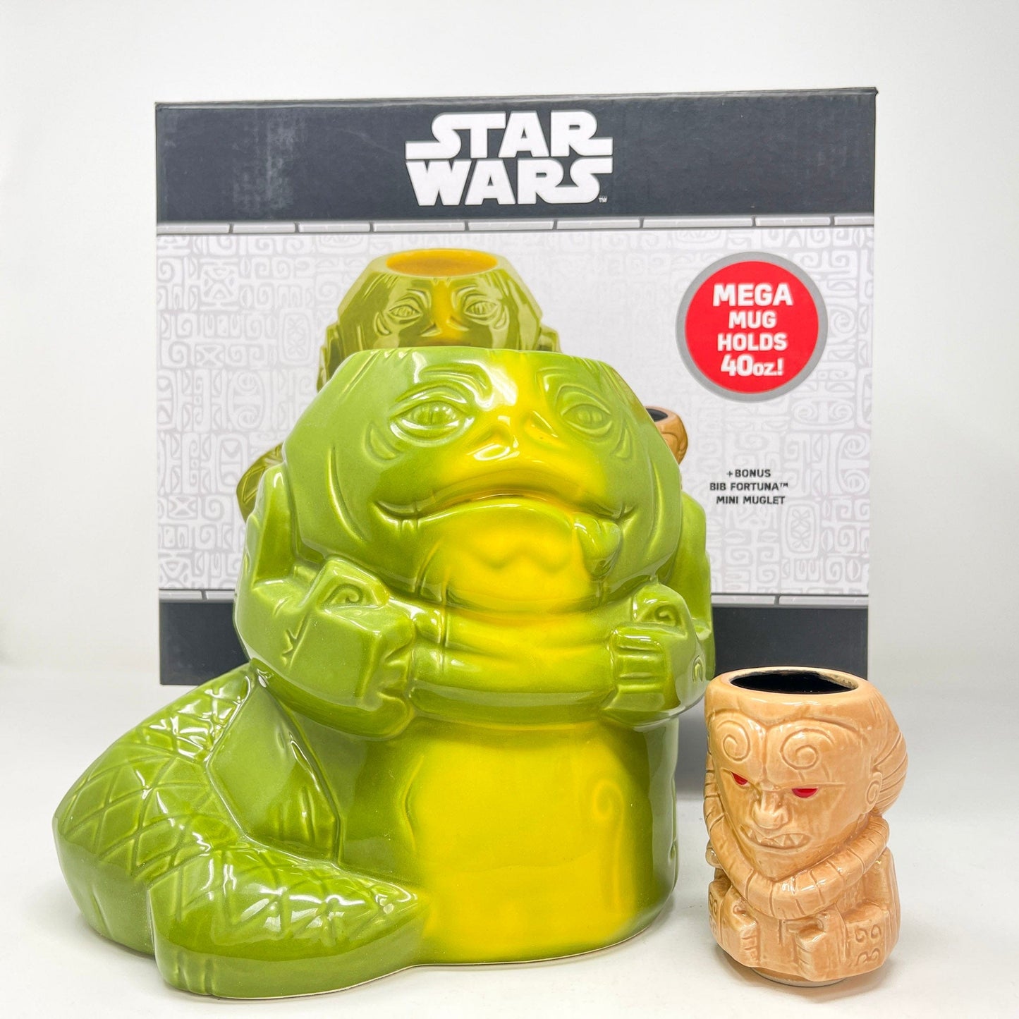 One MONSTEROUS mug: Relax, play a game of sabacc and sip a tropical drink from the Jabba the Hutt Geeki Tikis Mug with brand new Bib Fortuna mini muglet! The Jabba the Hutt Geeki Tikis Mug holds a hefty 40 ounces of your favorite beverage and the Bib Fortuna mini muglet holds 2 ounces.