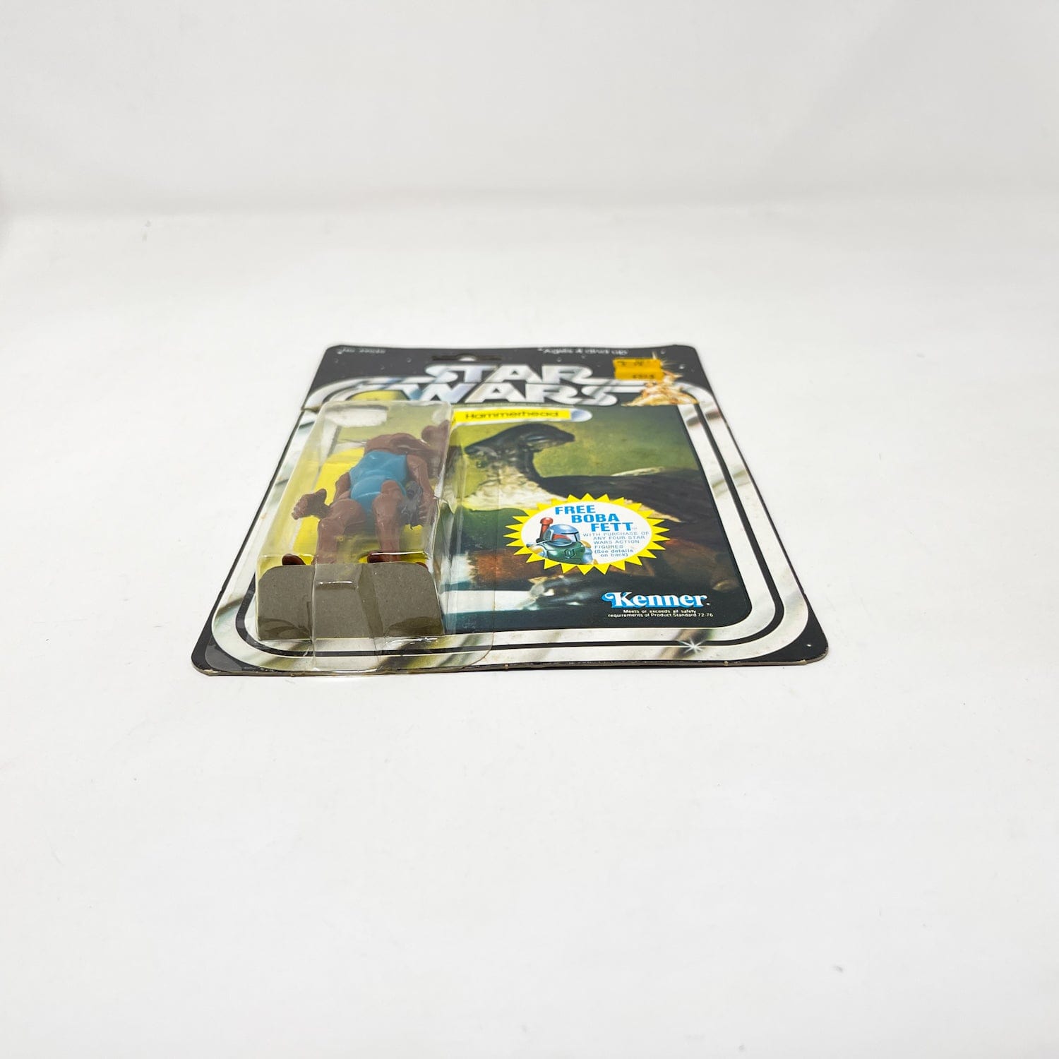 Hammerhead on a 20D-back with Free Boba Fett offer. This is the 20D version, with a black sticker masking the rocket firing image. Later they would change the sticker to have cool features of the figure.