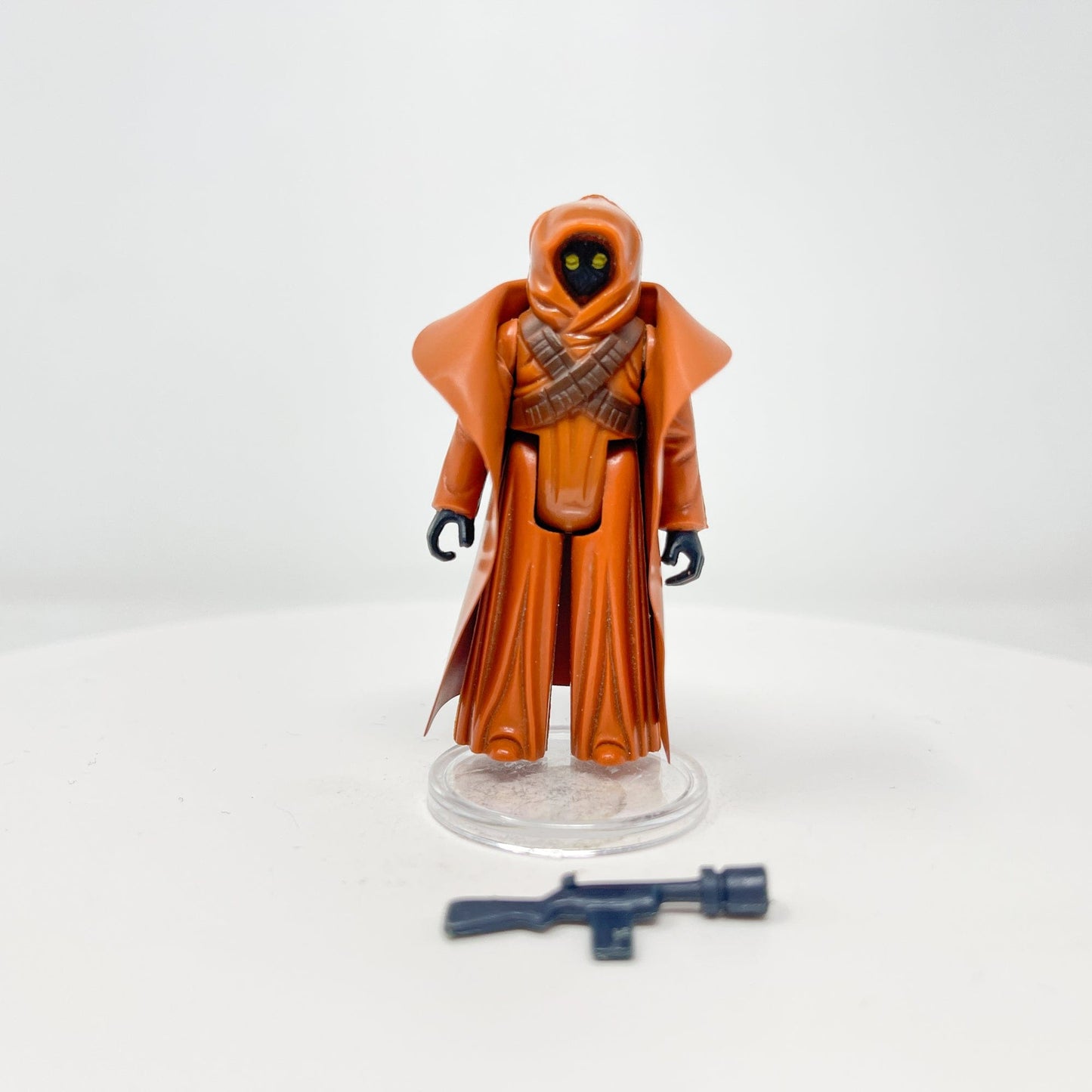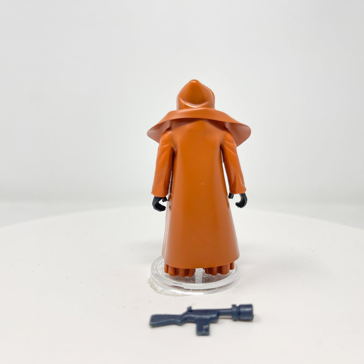 This vinyl cape Jawa is complete with original vinyl cape (with NO tears) and correct Kader factory blaster. The figure is also the correct one for VCJ, you can tell by the squared off thumb on one hand and COO.