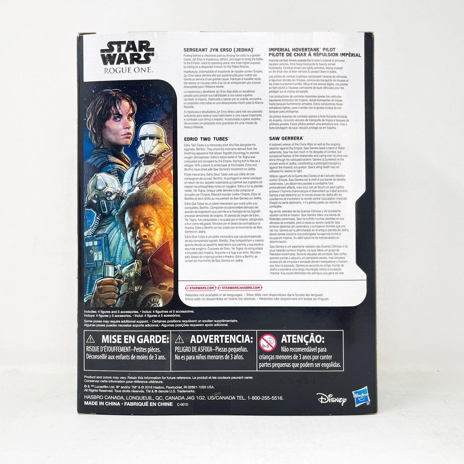 Rogue One Jedha Revolt 4-Pack includes: Sergeant Jyn Erso (Jedha), Edrio Two Tubes, Saw Gerrera, and Imperial Hovertank Pilot