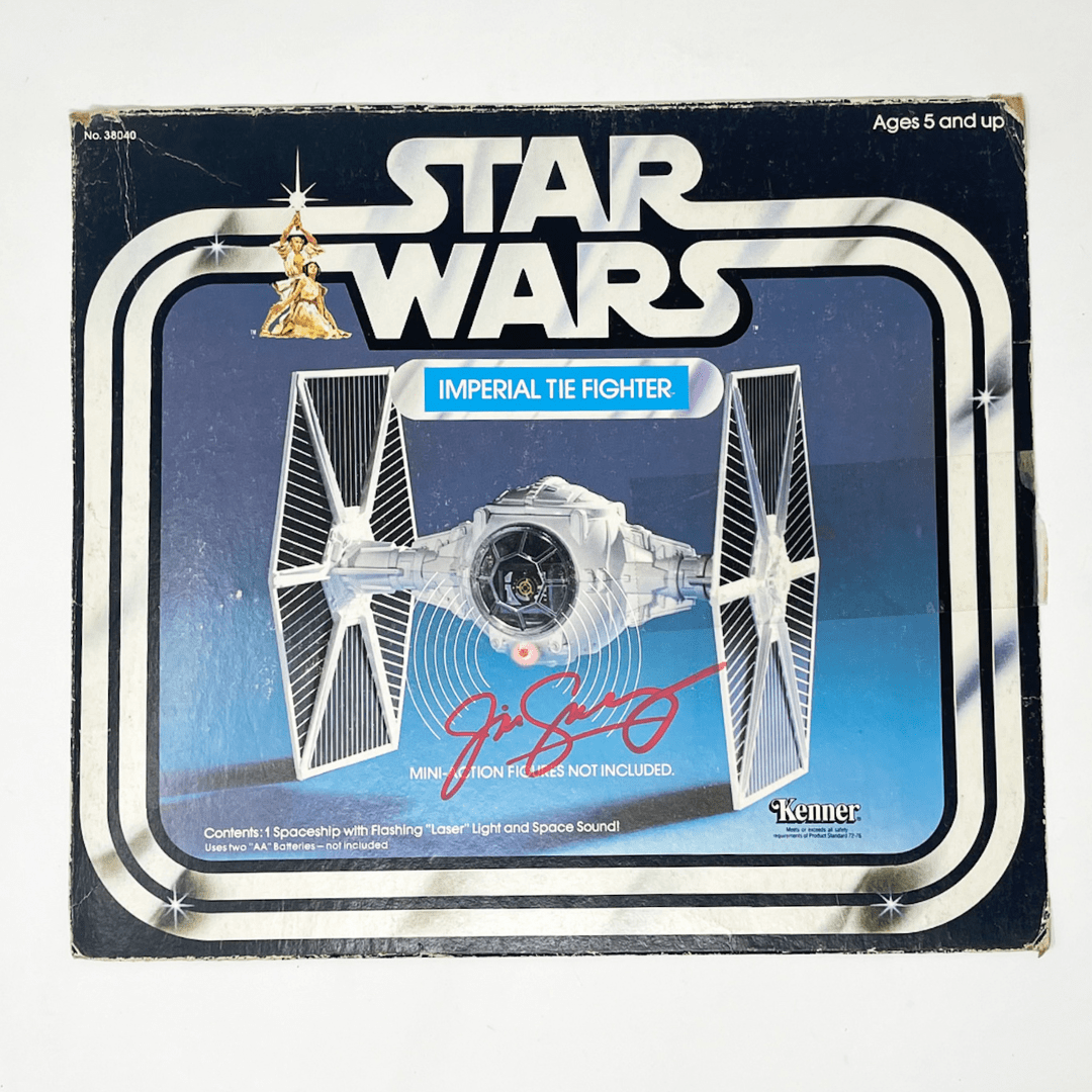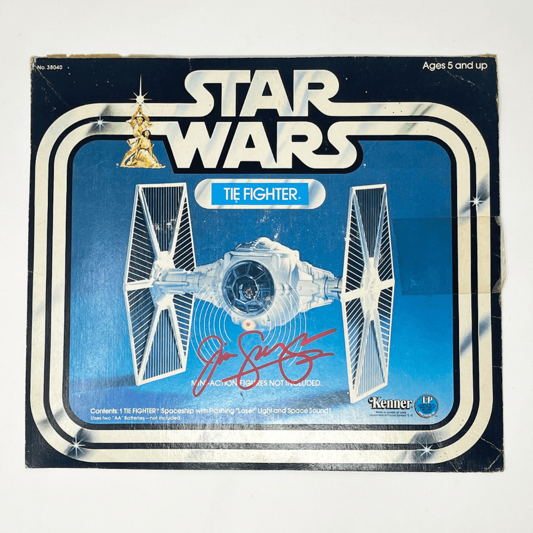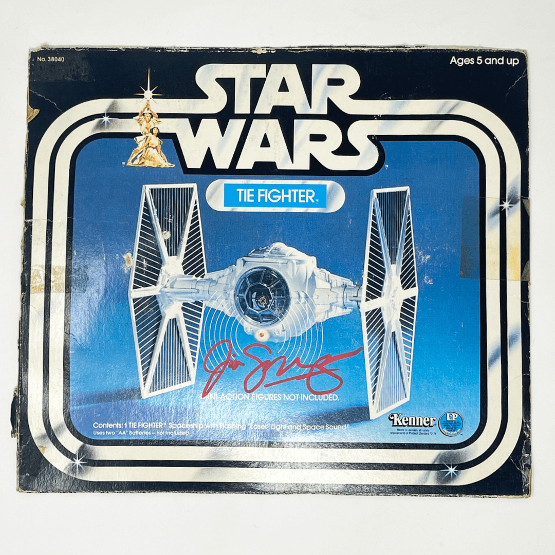Box front from an original vintage Kenner TIE Fighter, autographed by its prototype designer, Jim Swearingen. Ready to be framed.
