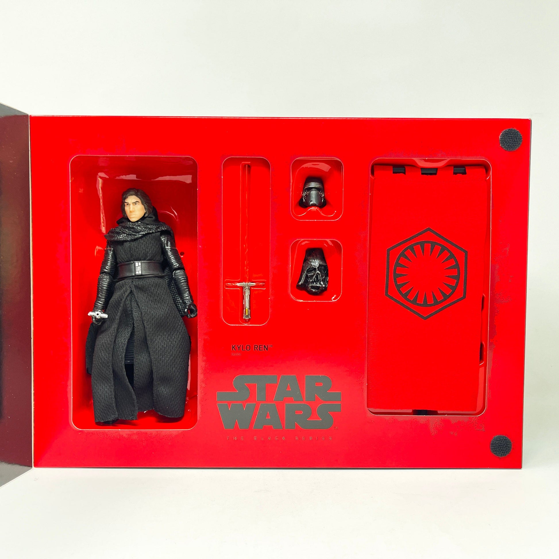 Exclusive at SDCC 2016, includes flip-front box, Kylo Ren with soft-goods cloak, saber, alternate helmeted head, Vader's funeral mask accessory and First Order Banner with stand.