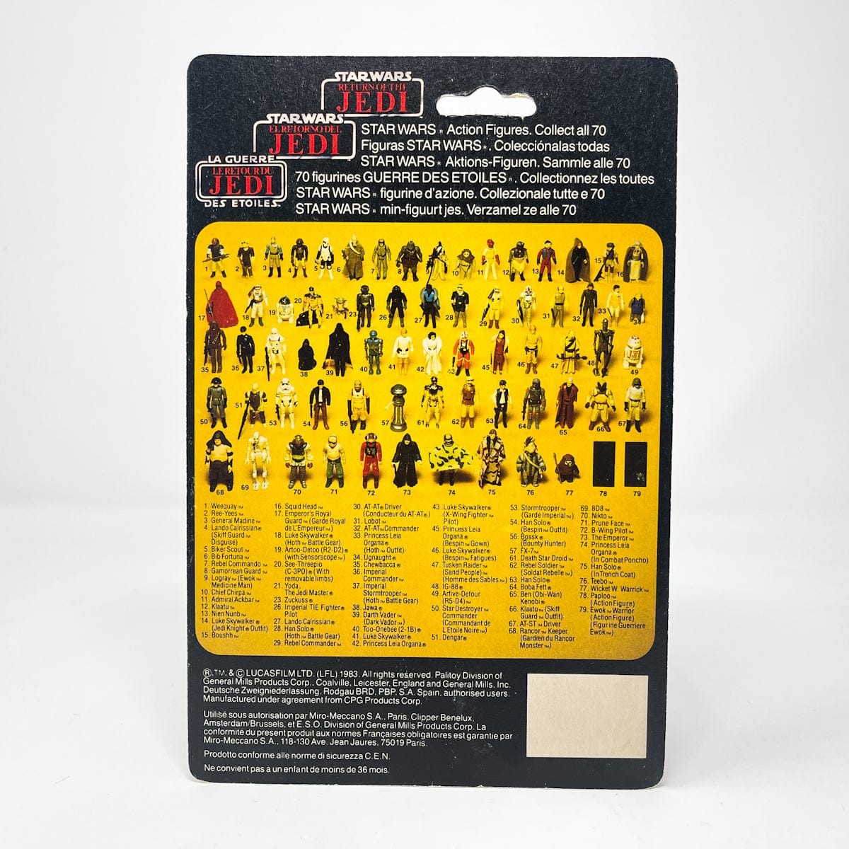 Mint and sealed on card (MOC) on Return of the Jedi Palitoy cardback. Figures on these cardbacks would have been sold throughout Europe and the UK.