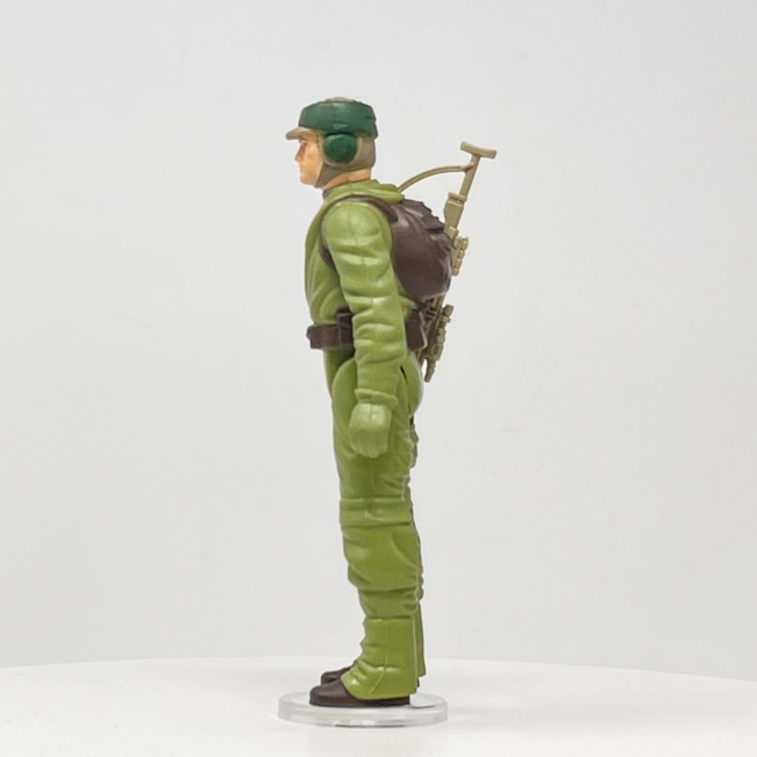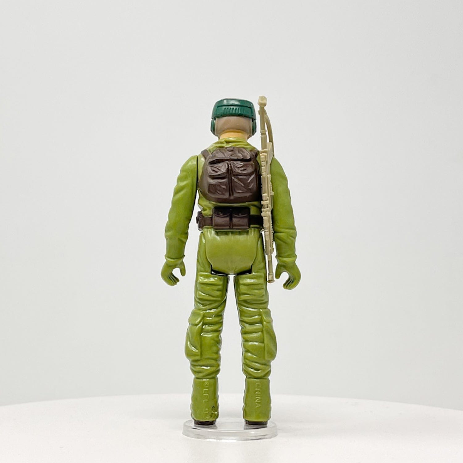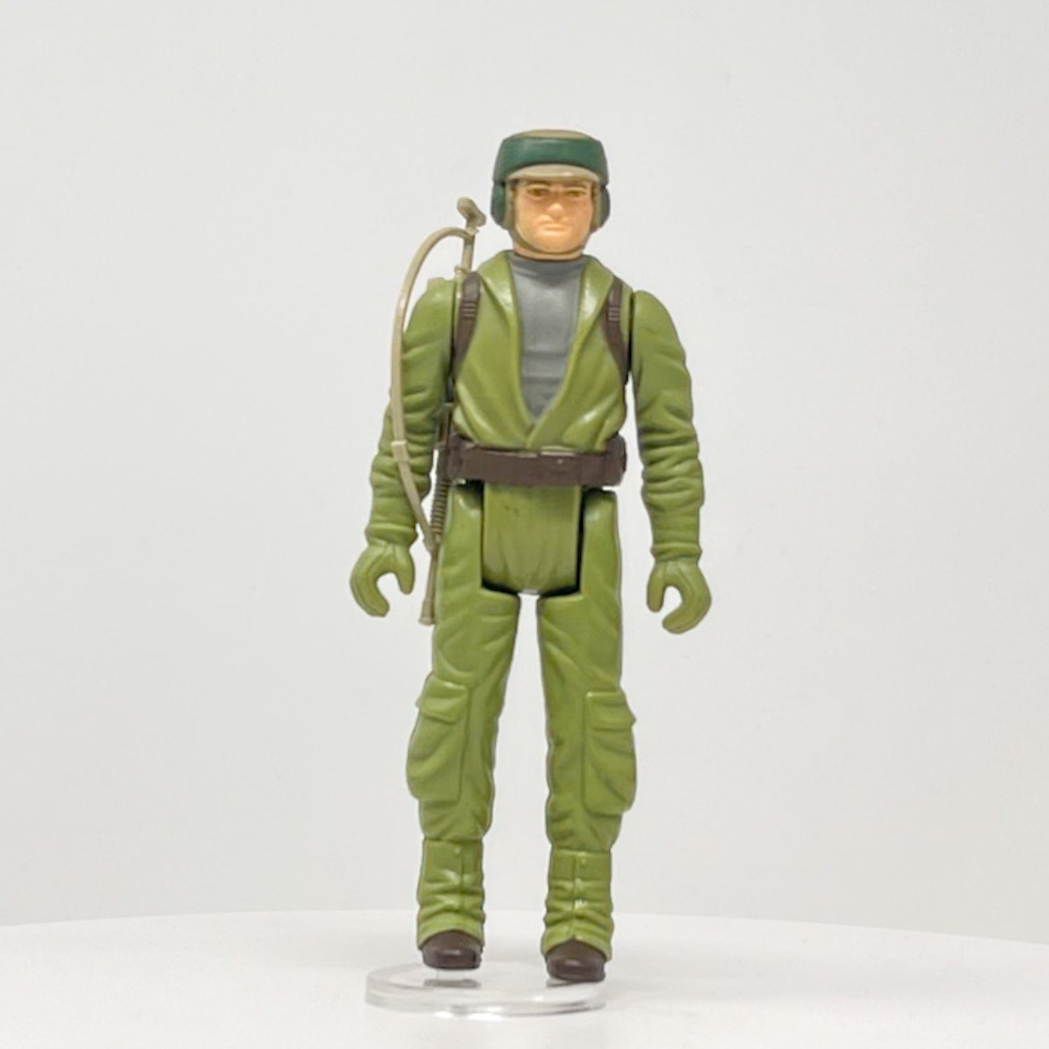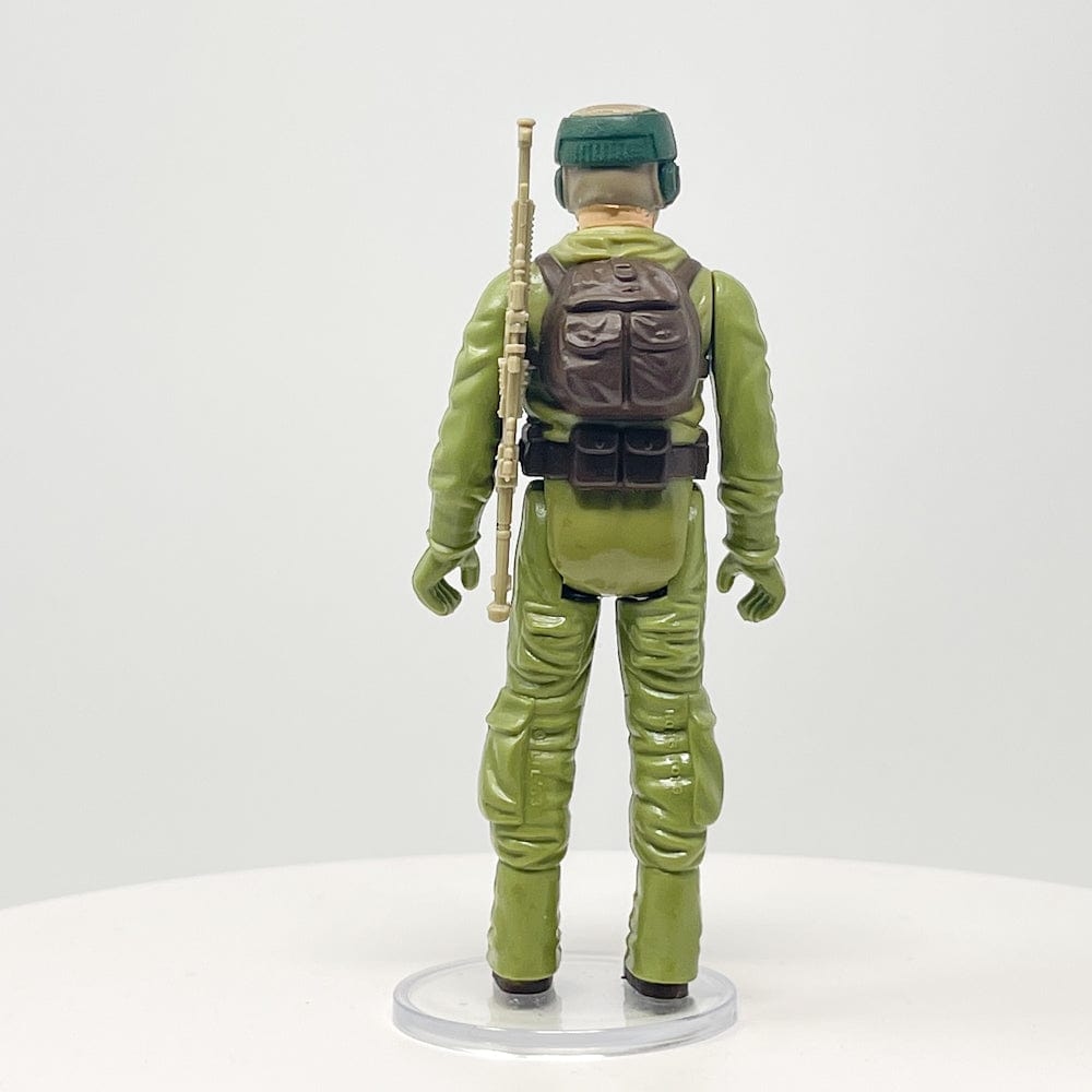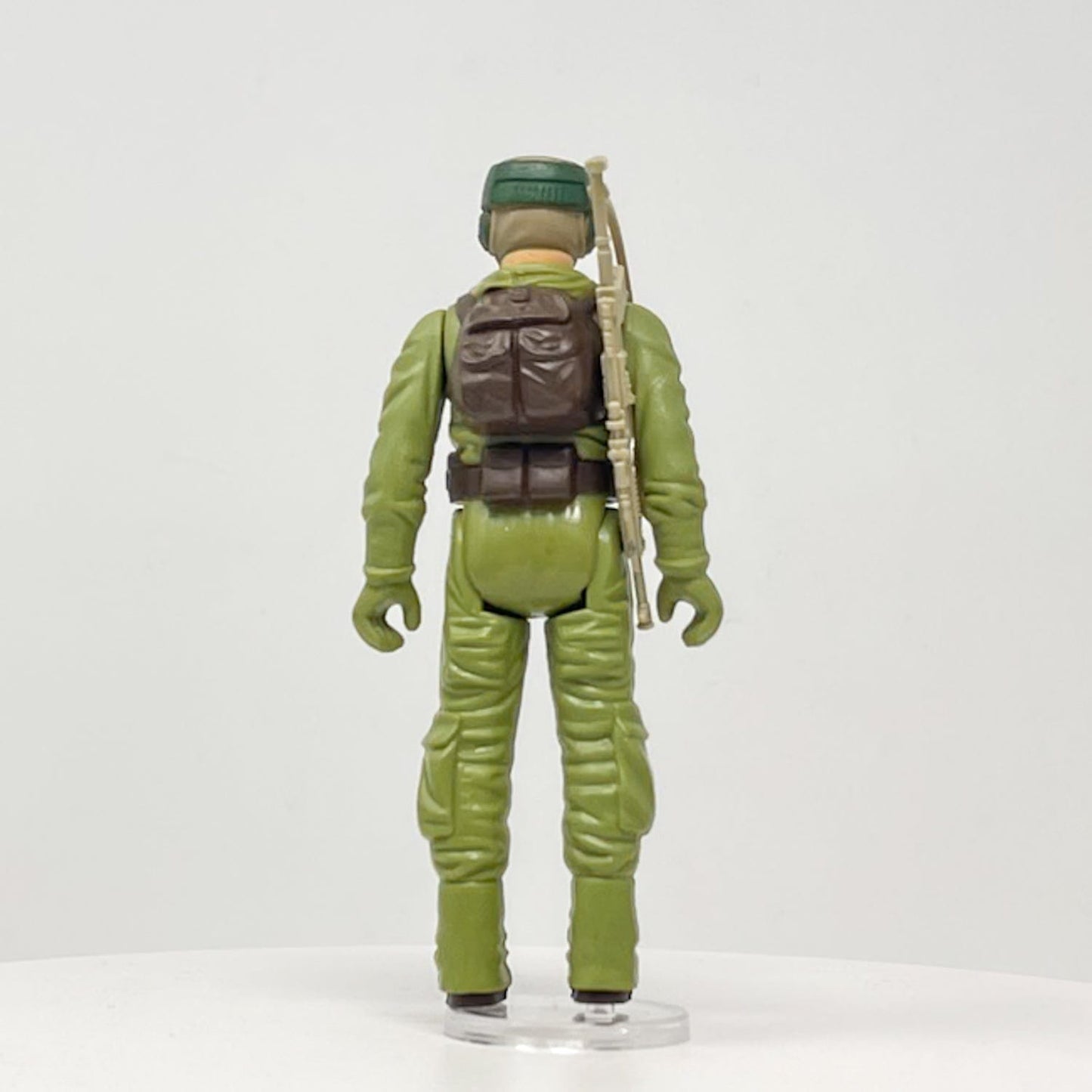 Rebel Commando from The Return of the Jedi complete with correct rifle. There are two major variants for the Rebel Commander; molded face and painted face. The molded face is molded in a skin color plastic, while the painted face uses paint for the skin color. Molded face are a little bit rarer than the painted face.