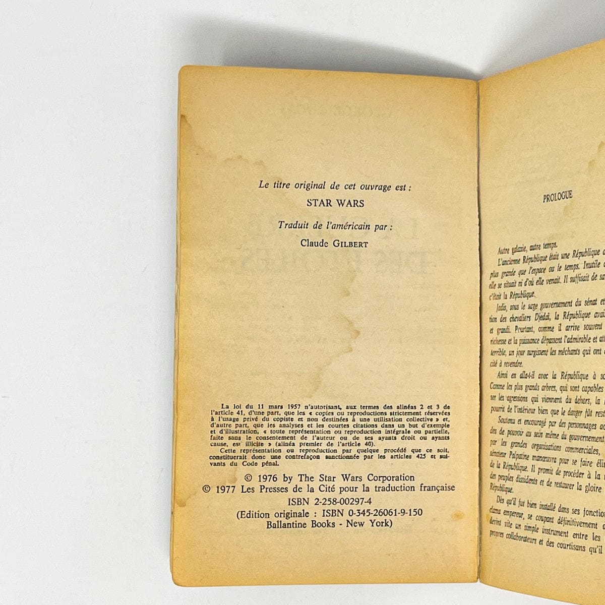 This appears to be the first printing of the Star Wars novel printed in French. Printed by Presses De La Cite - Montreal.