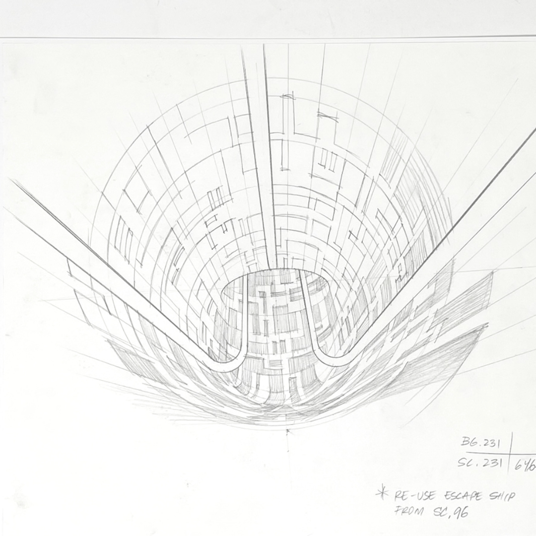 This is an original, hand drawn background concept board from the Genndy Tartakovsky 2D Clone Wars animated series. From the collection of Paul Rudish, Art Director on the series.