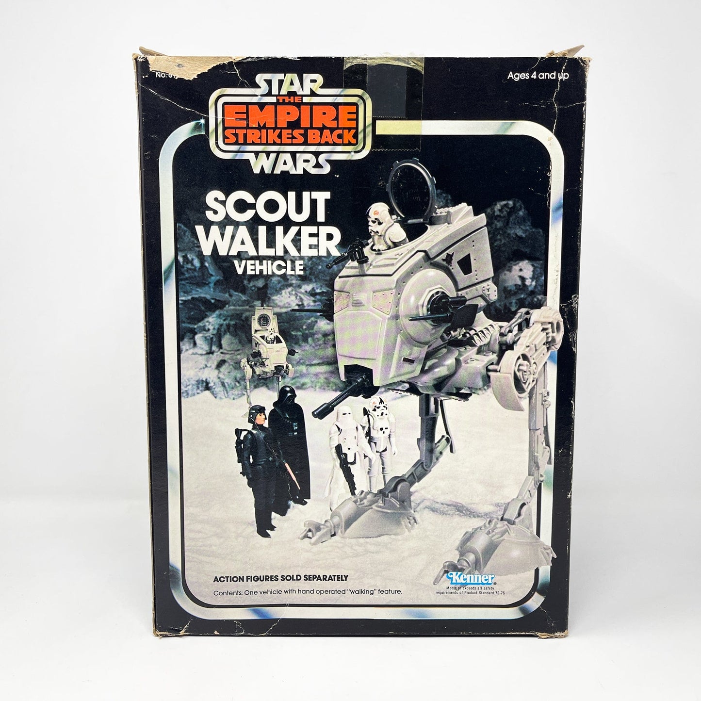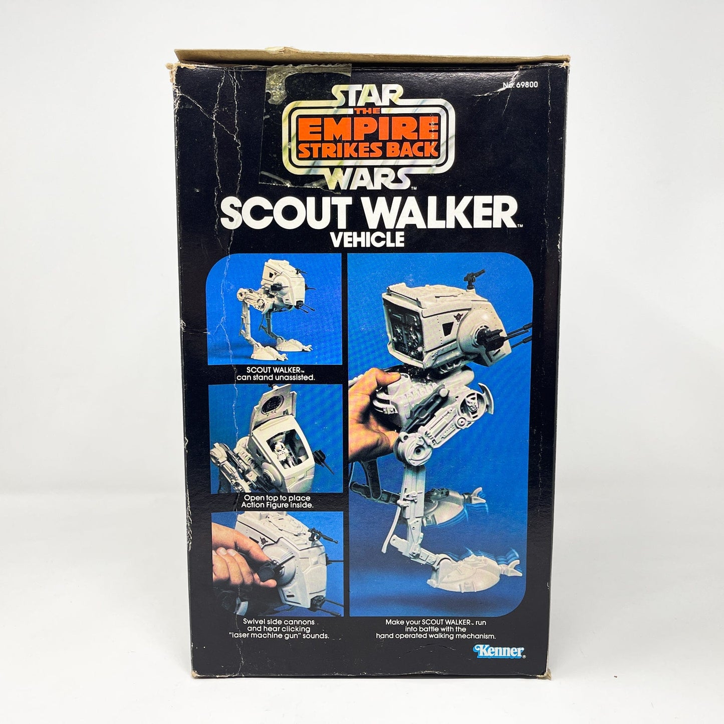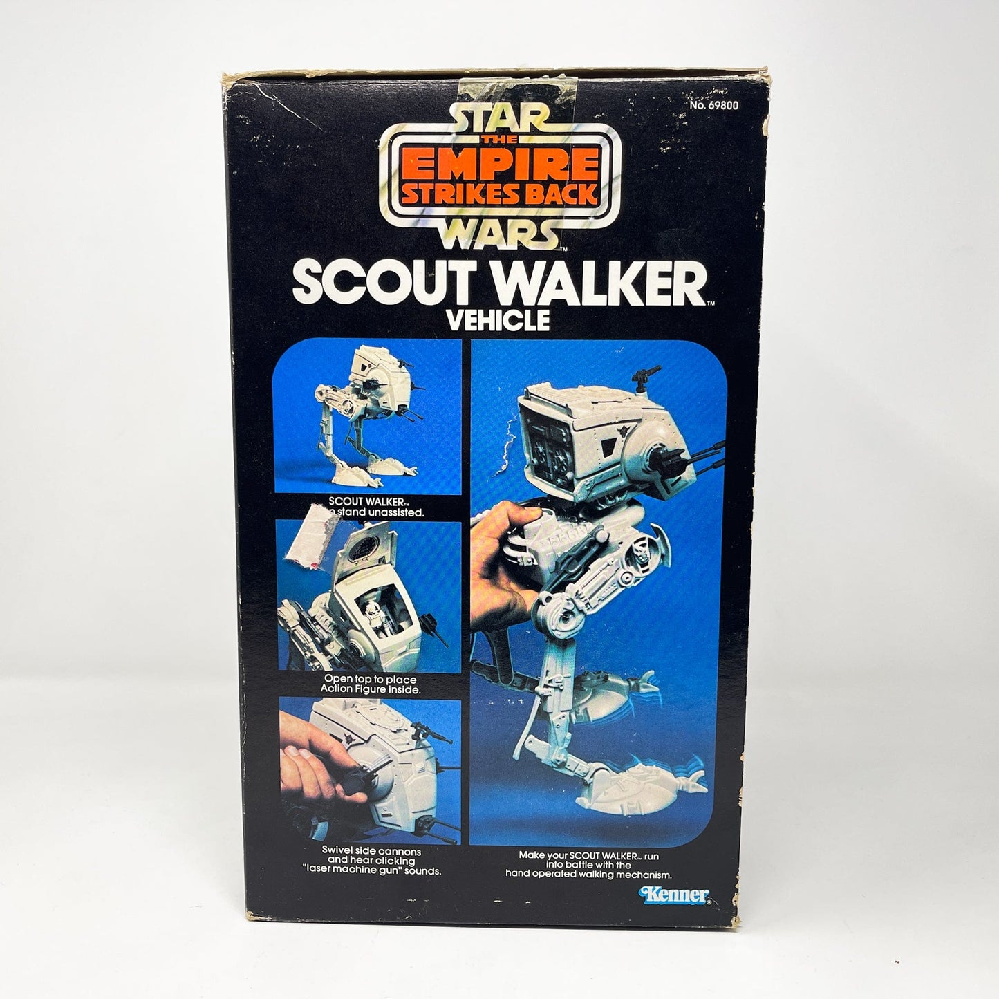 AT-ST in Kenner Empire Strikes Back box. Also known as the Chicken Walker, the toy has a fun walking action when you push the button on the back up and down. AT-ST is complete with top-hatch, top-hatch gun, side and front cannons. Stands without problem. Also includes instruction manual.