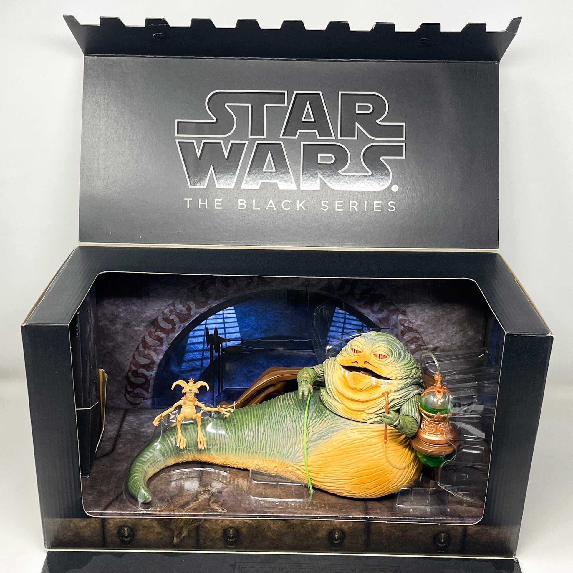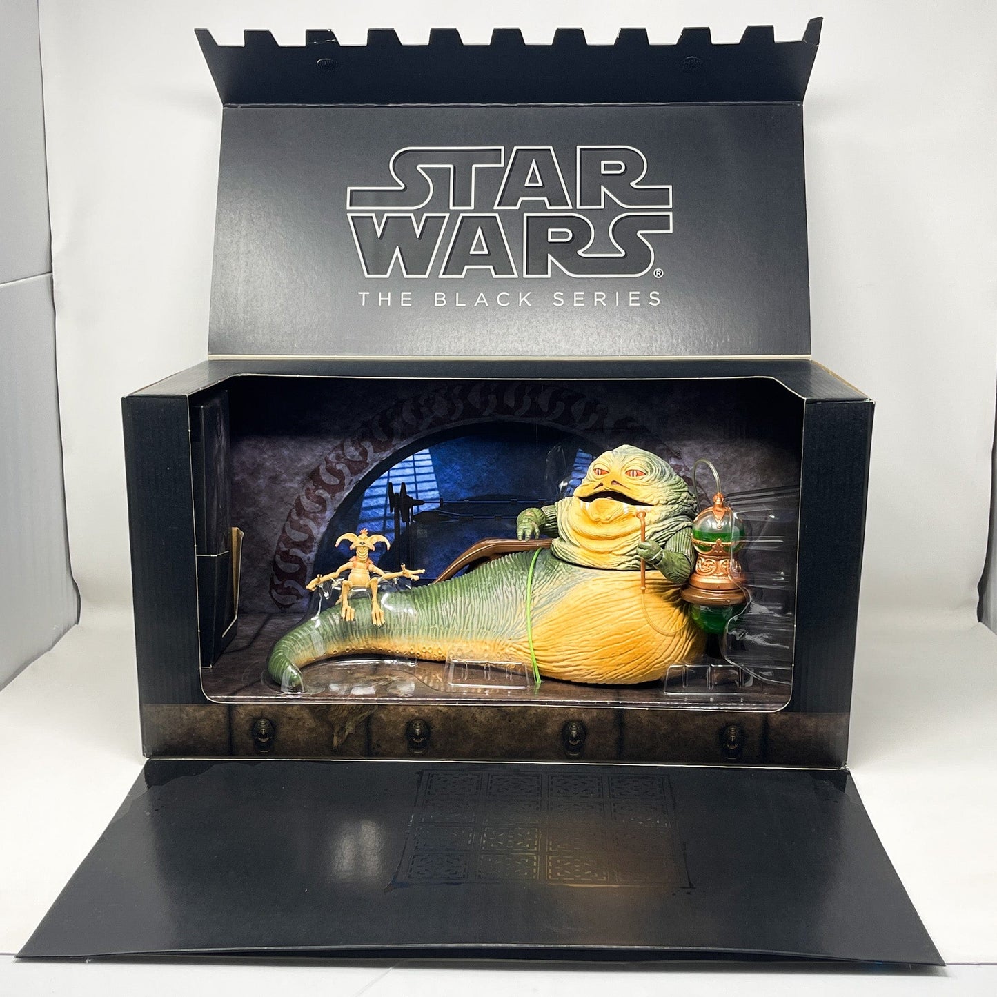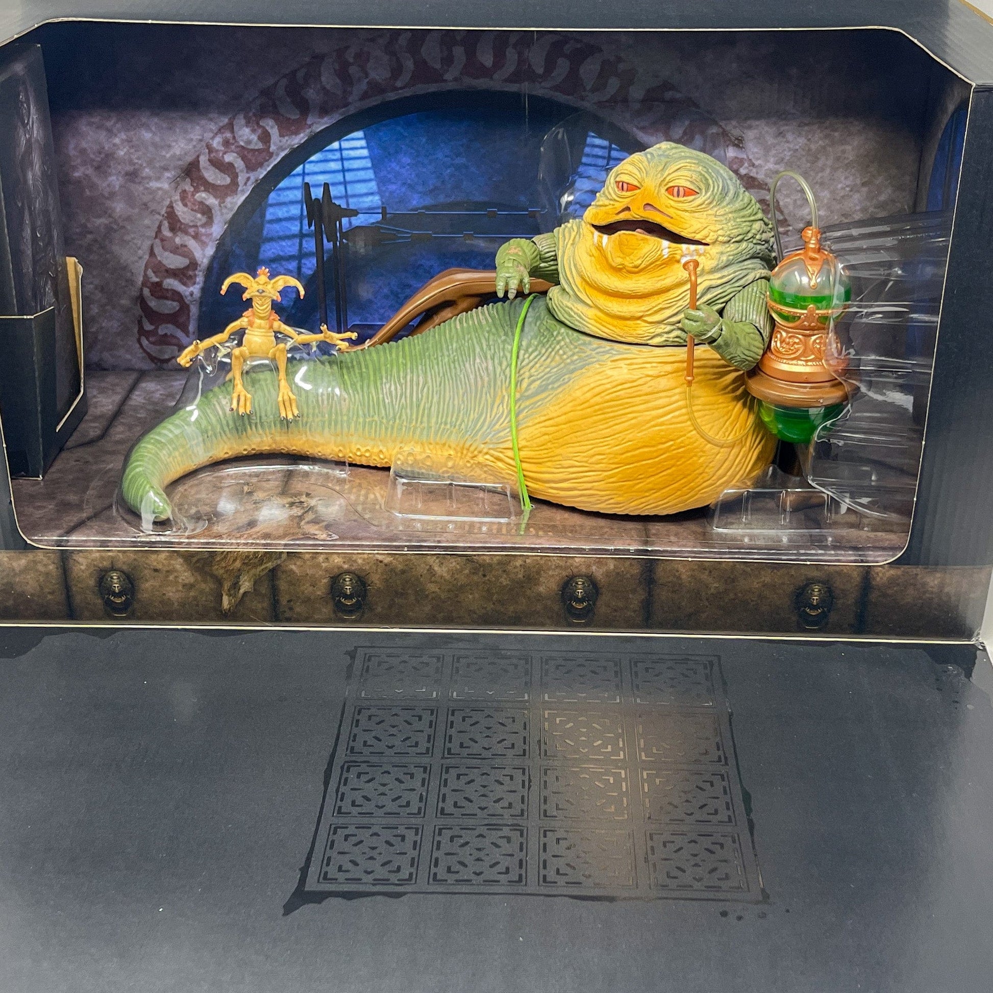 Originally released as a San Diego Comic-Con 2014 exclusive, this deluxe Black Series Jabba’s Throne Room set includes Jabba the Hutt and his mischievous sidekick Salacious Crumb, displayed in an ornate collector box styled after Jabba’s palace from Return of the Jedi. The set features detailed sculpting, a movable tail, and accessories including a hookah pipe, railing, and dais, all designed for display in the 6-inch Black Series scale.