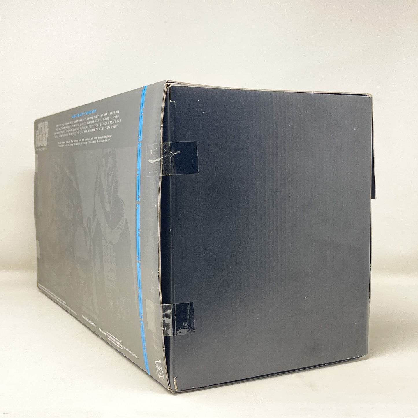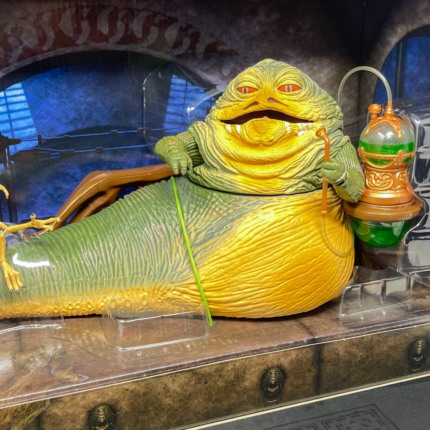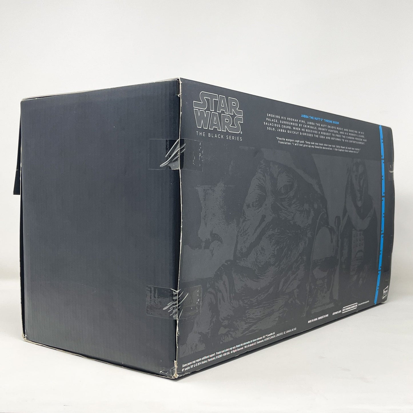 Originally released as a San Diego Comic-Con 2014 exclusive, this deluxe Black Series Jabba’s Throne Room set includes Jabba the Hutt and his mischievous sidekick Salacious Crumb, displayed in an ornate collector box styled after Jabba’s palace from Return of the Jedi. The set features detailed sculpting, a movable tail, and accessories including a hookah pipe, railing, and dais, all designed for display in the 6-inch Black Series scale.