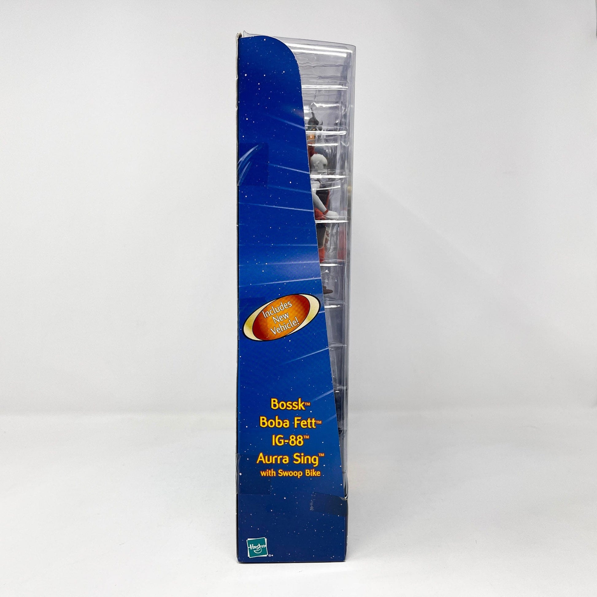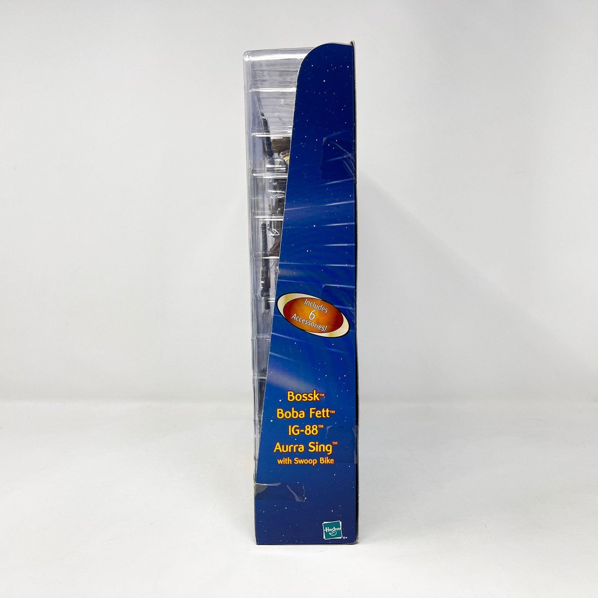 Boba Fett with Soft Goods Cape, Bossk, IG-88, Aurra Sing with Swoop Bike and 4 plastic stands in a cool window box.