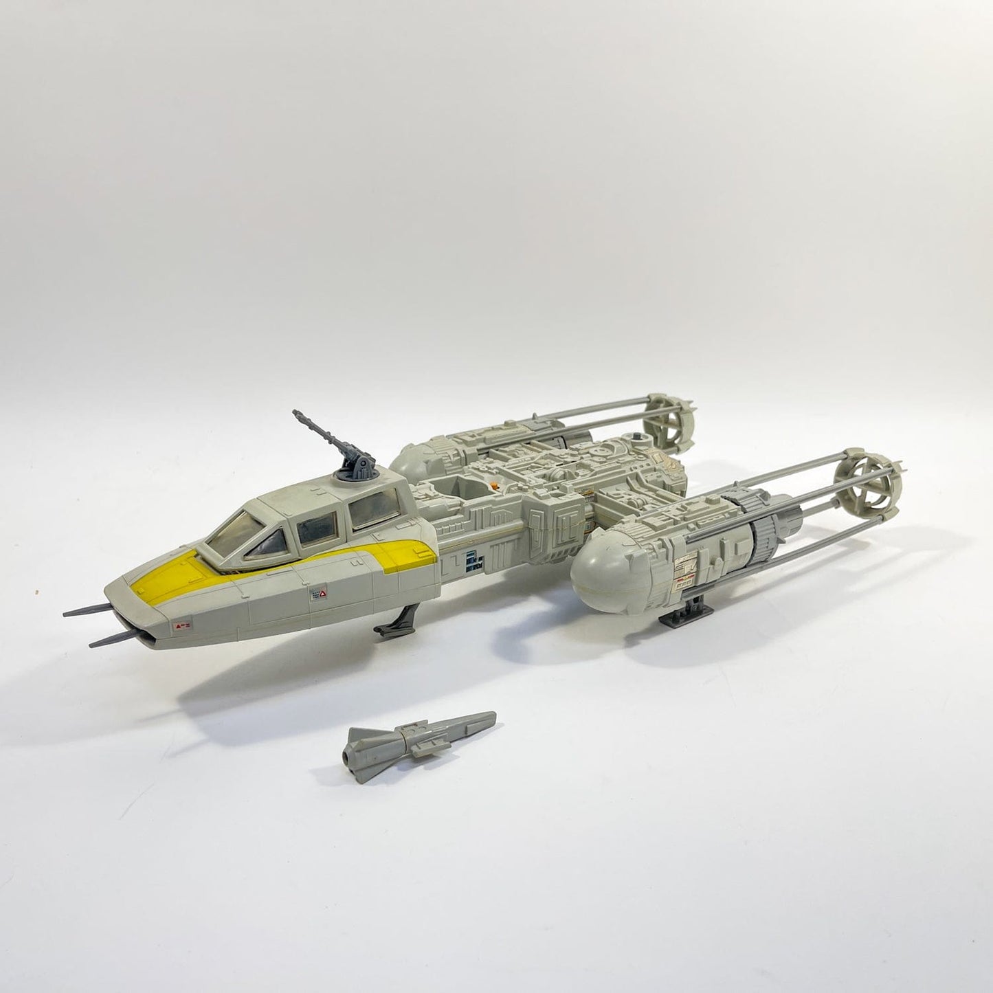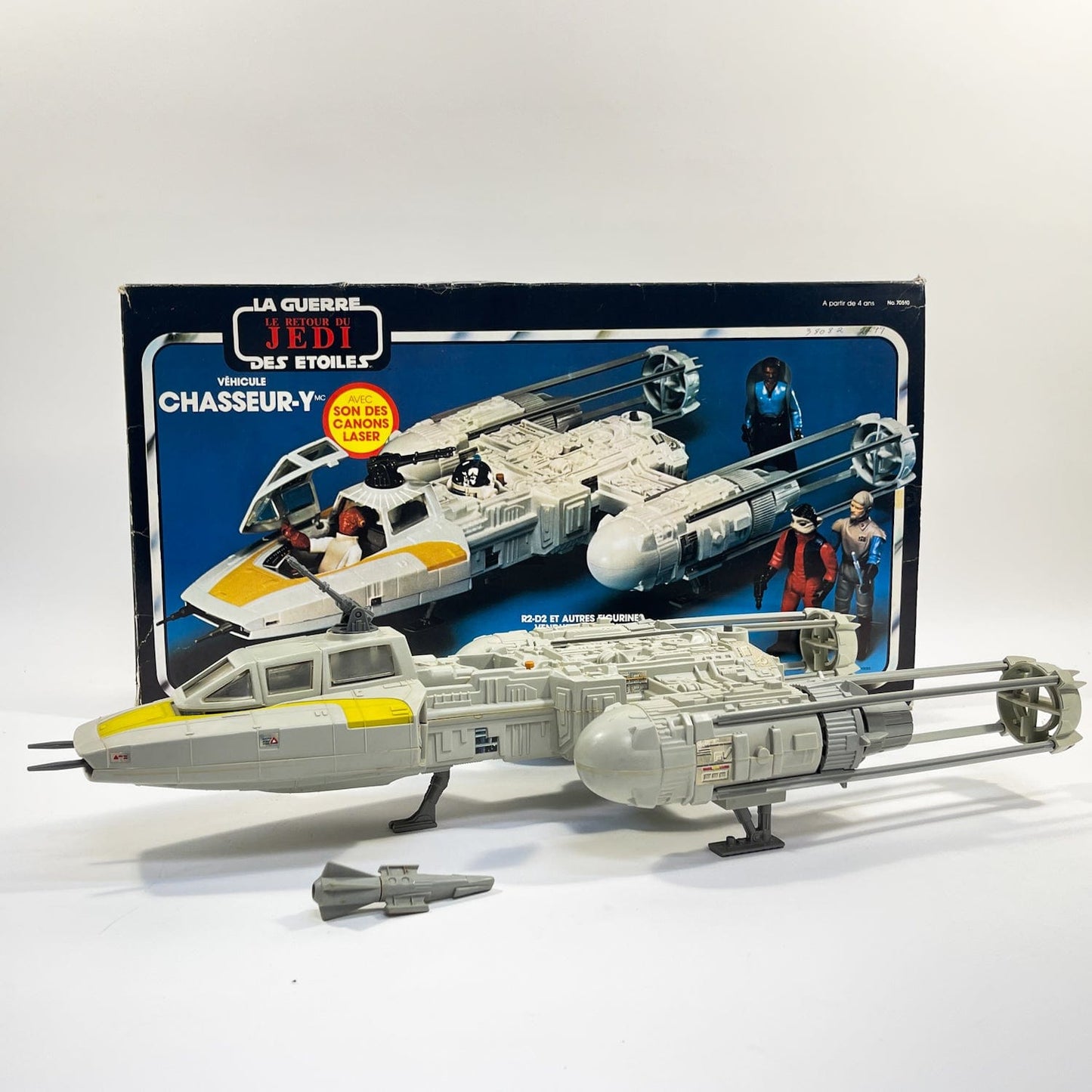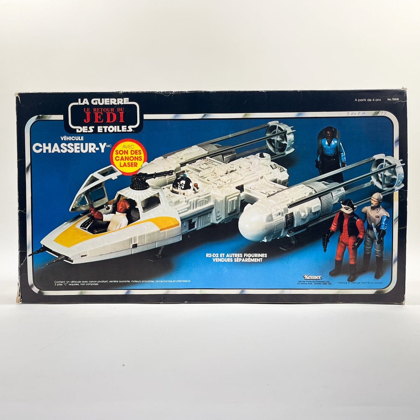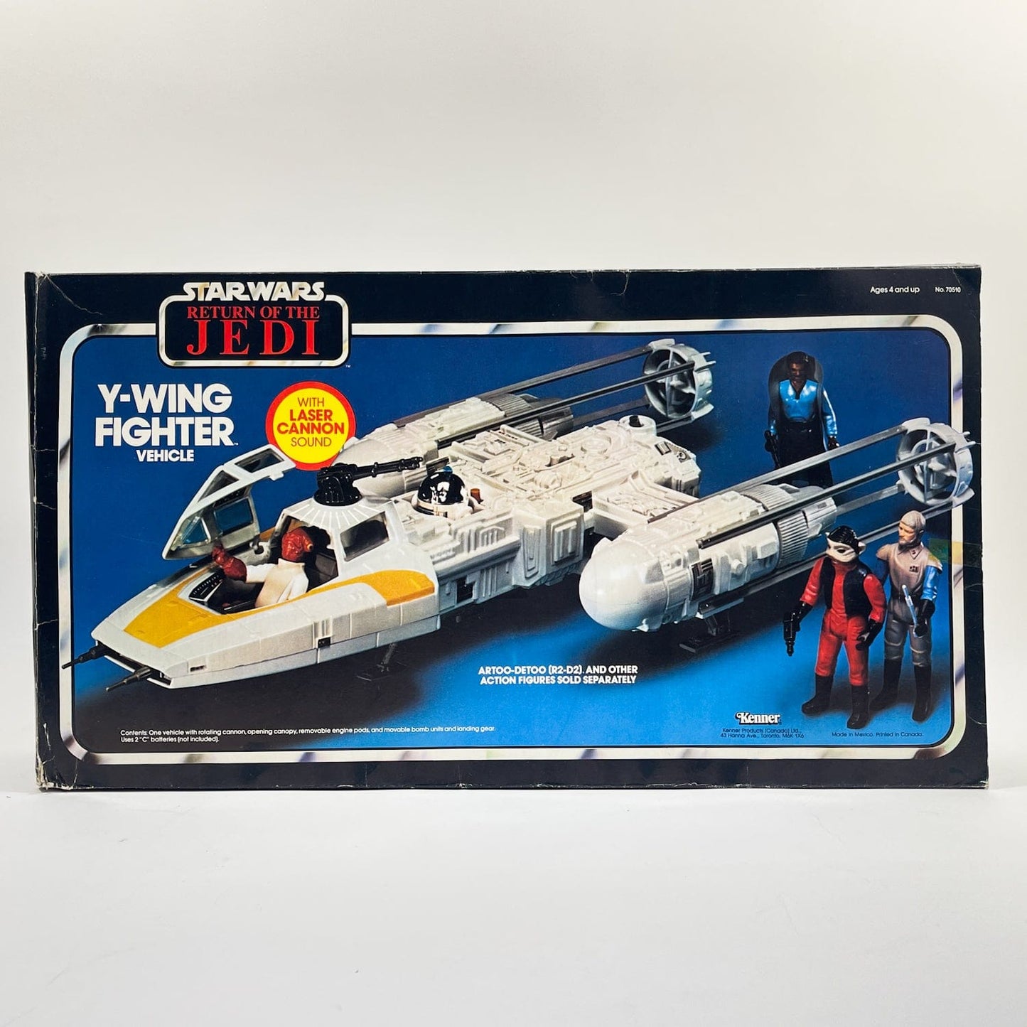 Vintage Kenner Y-Wing toy loose and complete in Canadian box. Made by Kenner for Return of the Jedi. This ship has lots of easy to lose parts, but this guy comes complete with all of them including chin guns, top cannon, struts, engines and both parts of the bomb and working landing gear.