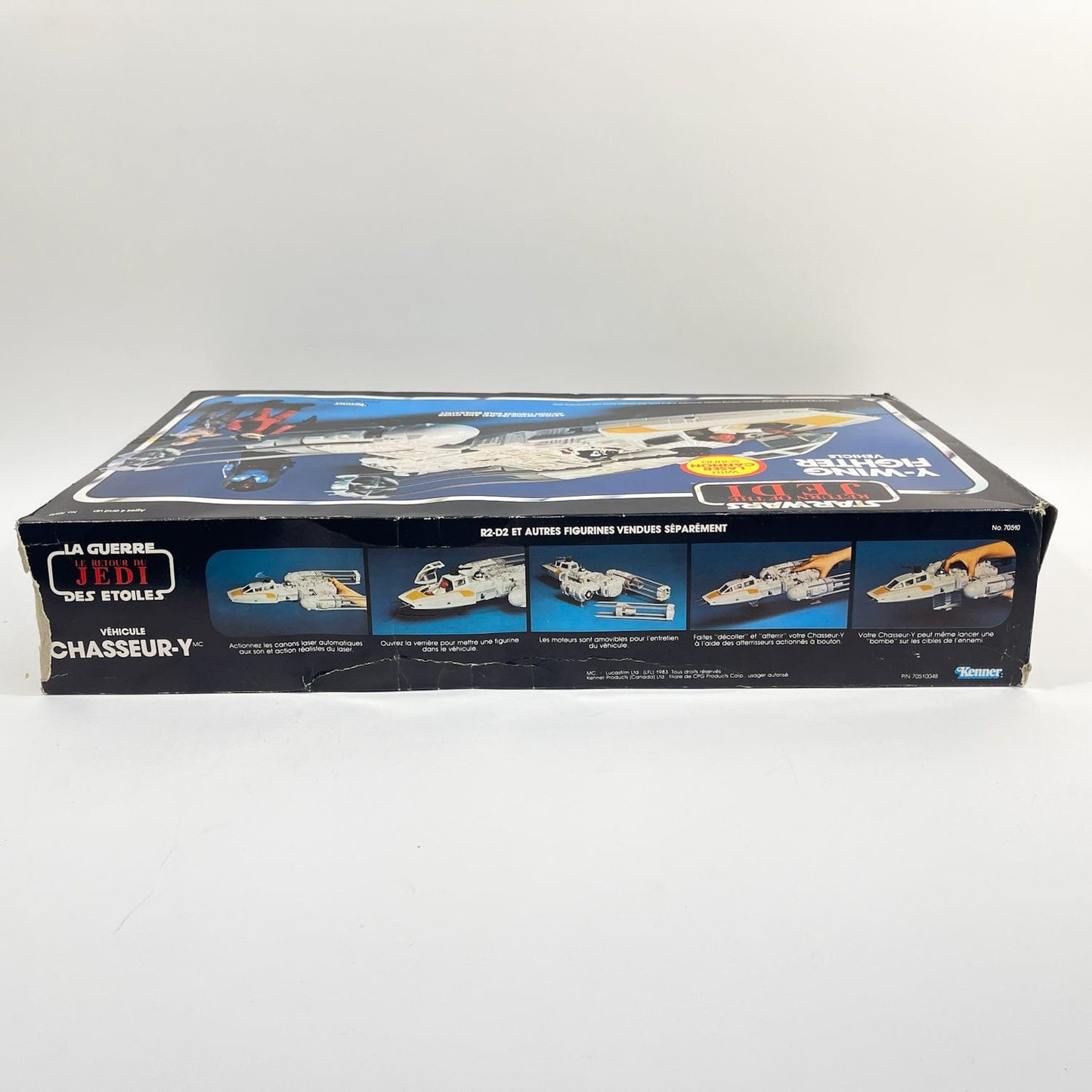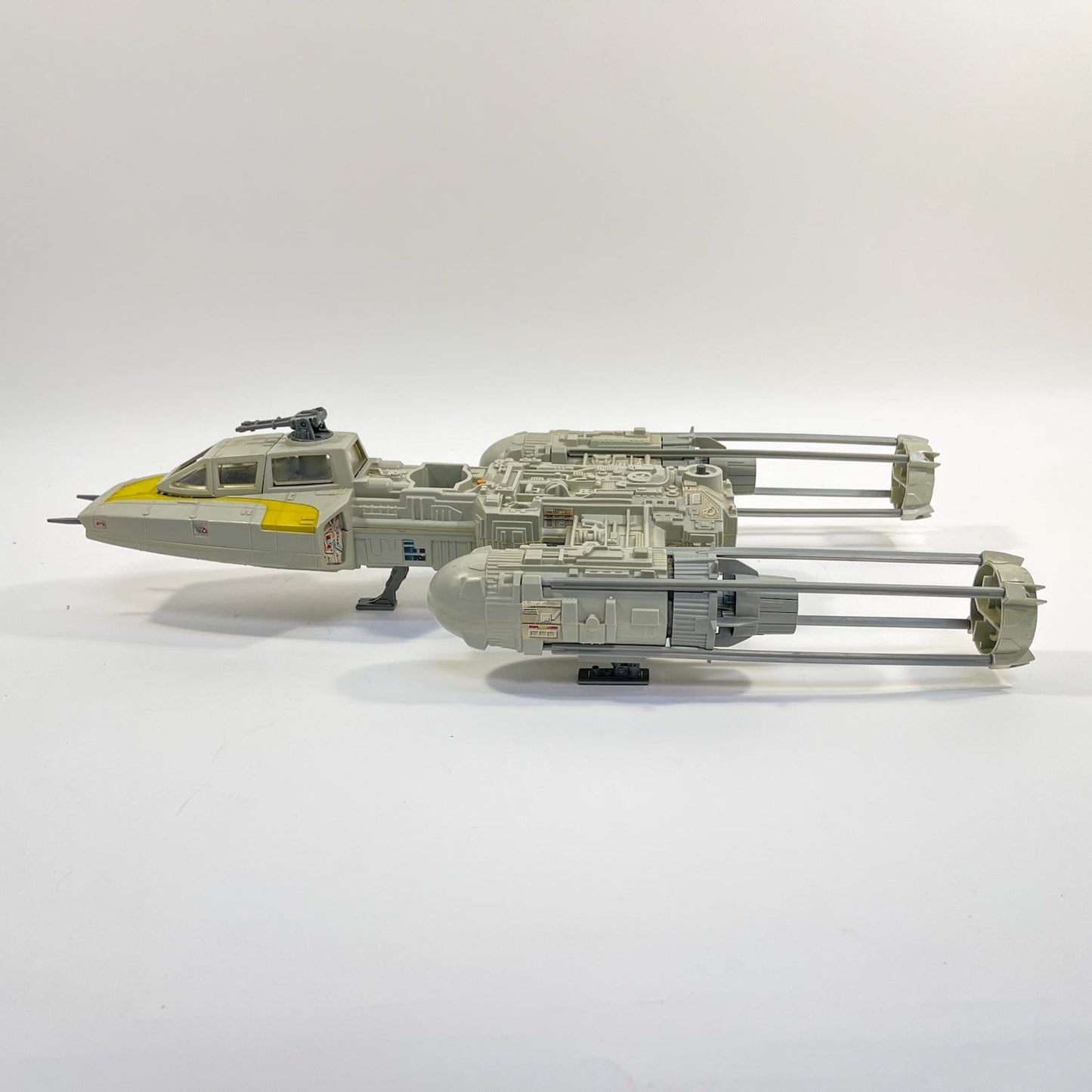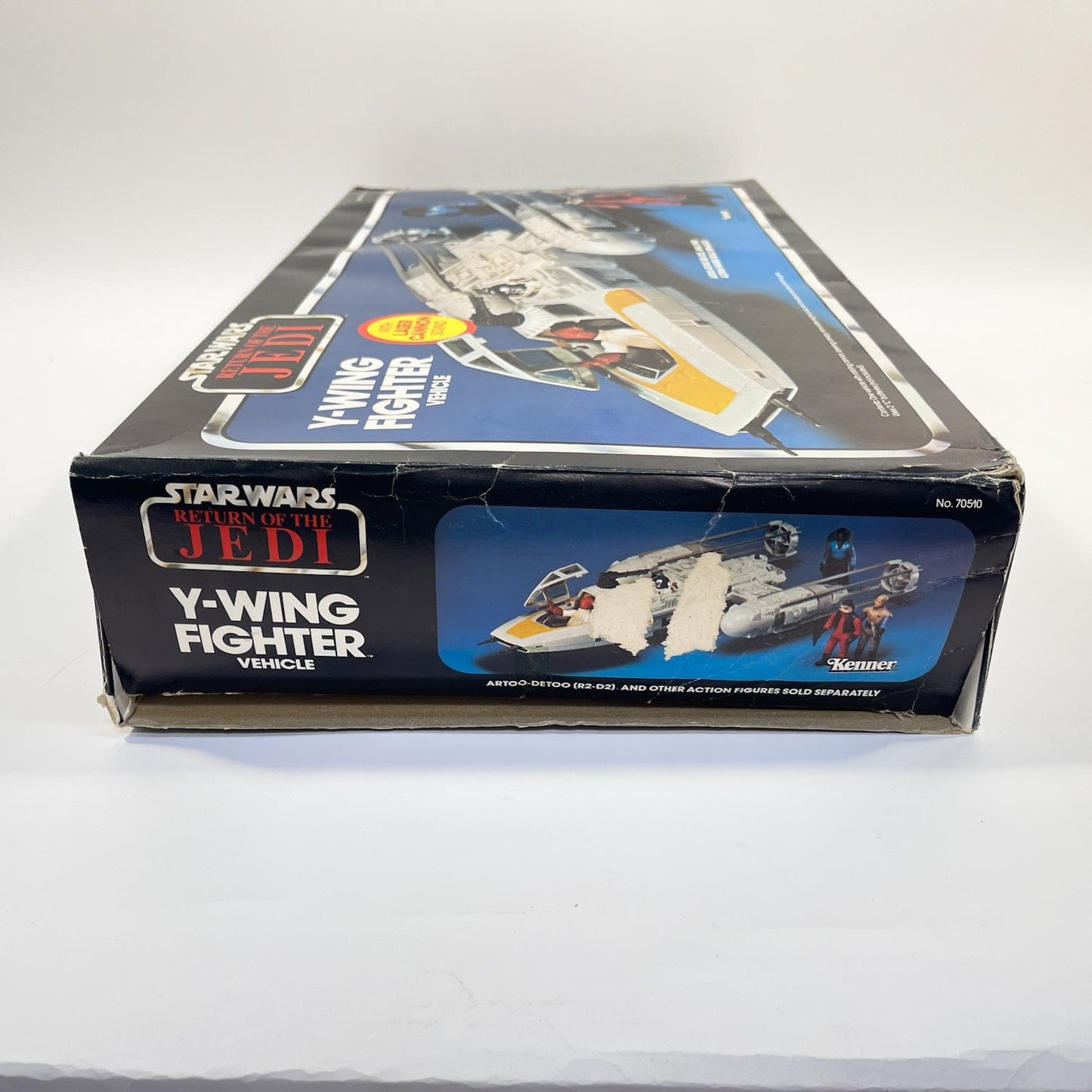 Vintage Kenner Y-Wing toy loose and complete in Canadian box. Made by Kenner for Return of the Jedi. This ship has lots of easy to lose parts, but this guy comes complete with all of them including chin guns, top cannon, struts, engines and both parts of the bomb and working landing gear.