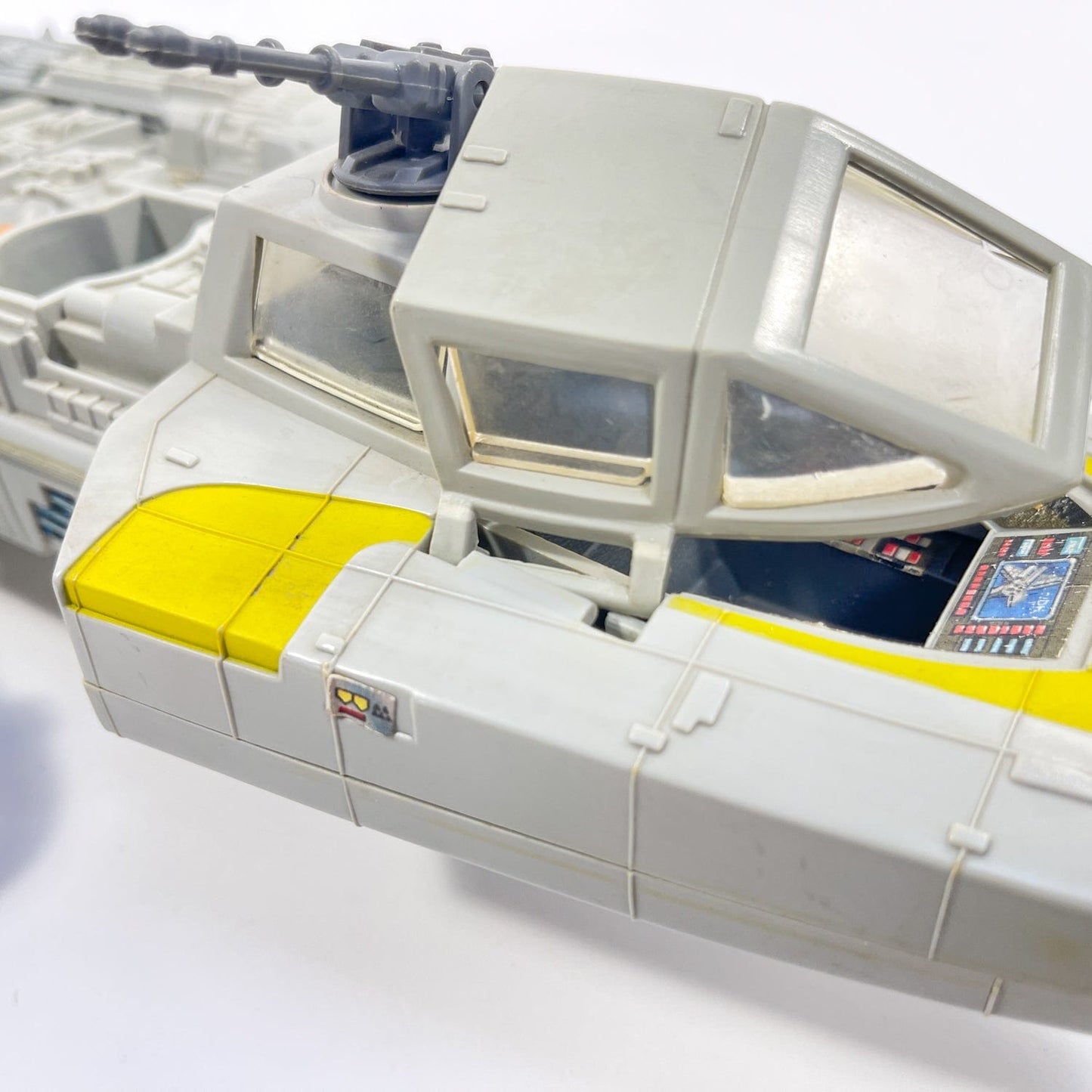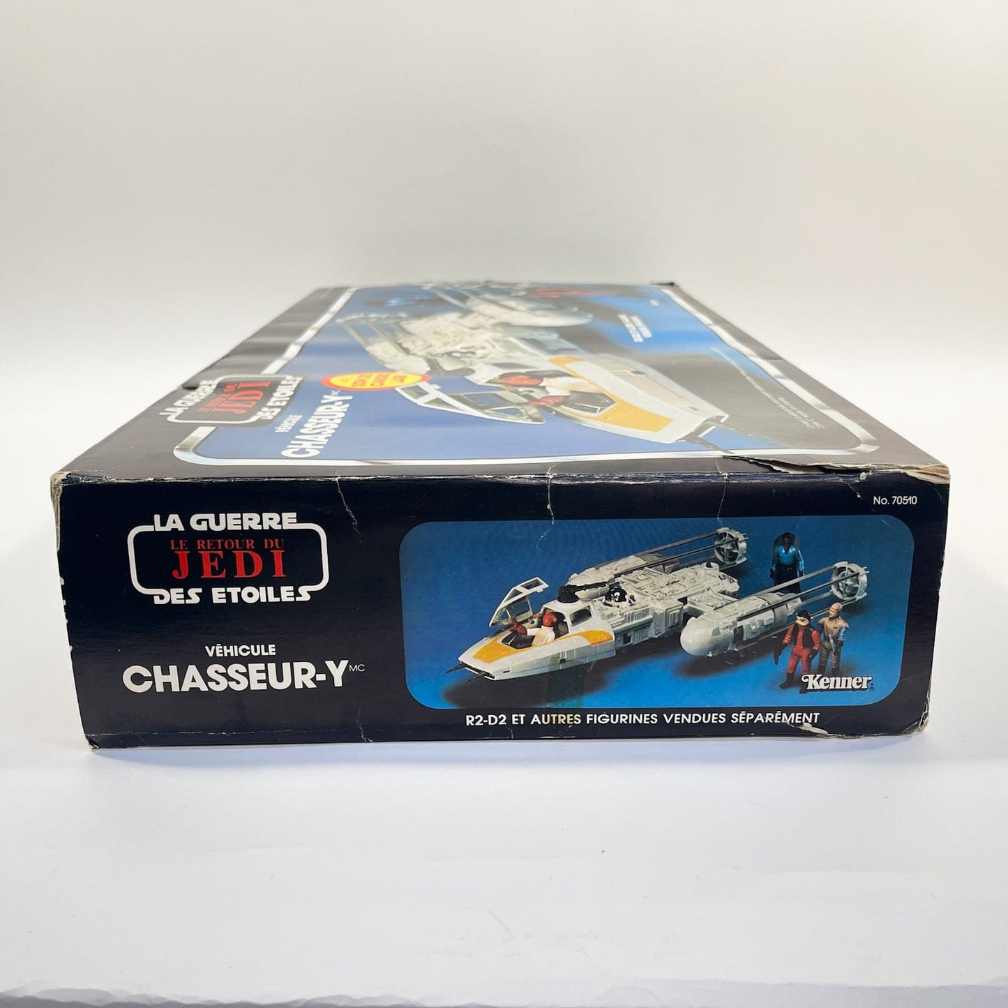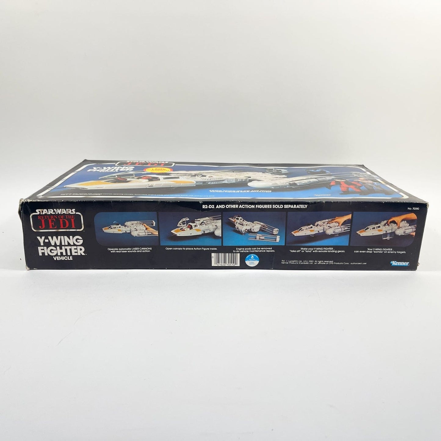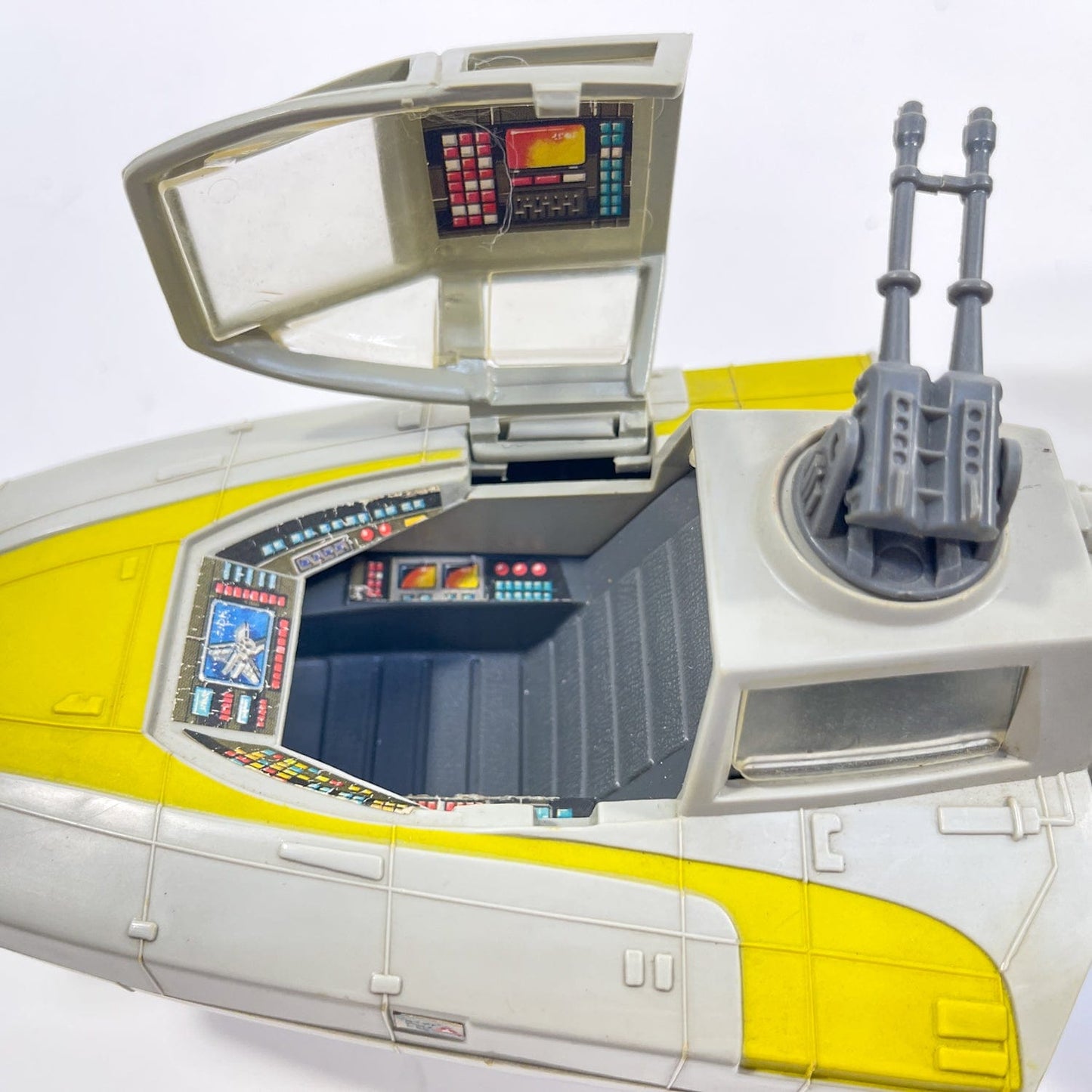 Vintage Kenner Y-Wing toy loose and complete in Canadian box. Made by Kenner for Return of the Jedi. This ship has lots of easy to lose parts, but this guy comes complete with all of them including chin guns, top cannon, struts, engines and both parts of the bomb and working landing gear.